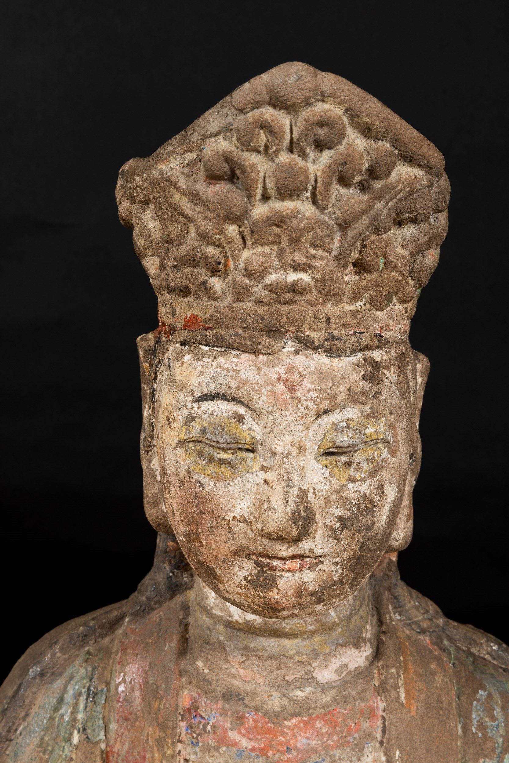 Rara e grande e rara figura di Guanyin incoronata seduta in pietra, Cina, Dinastia [..]