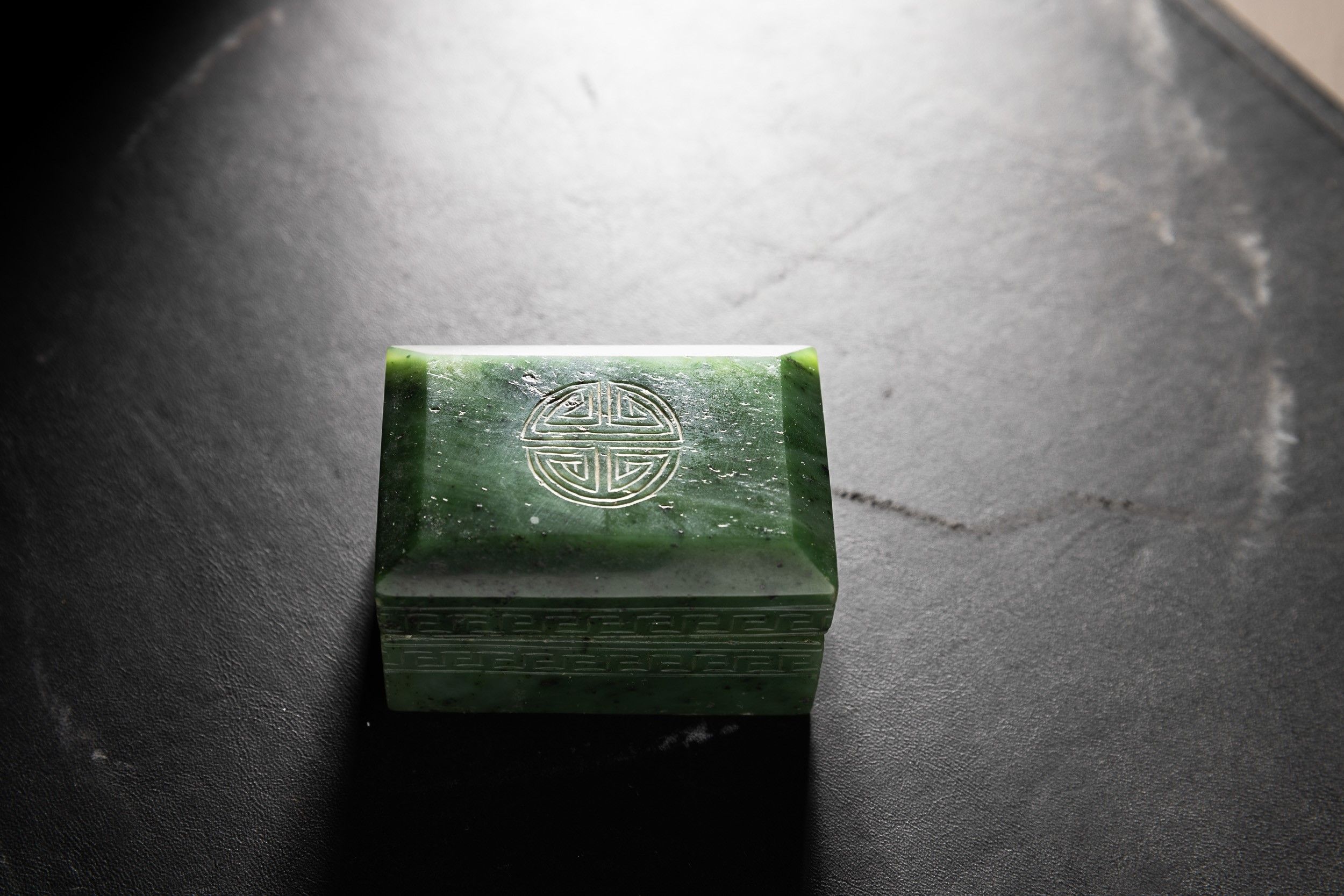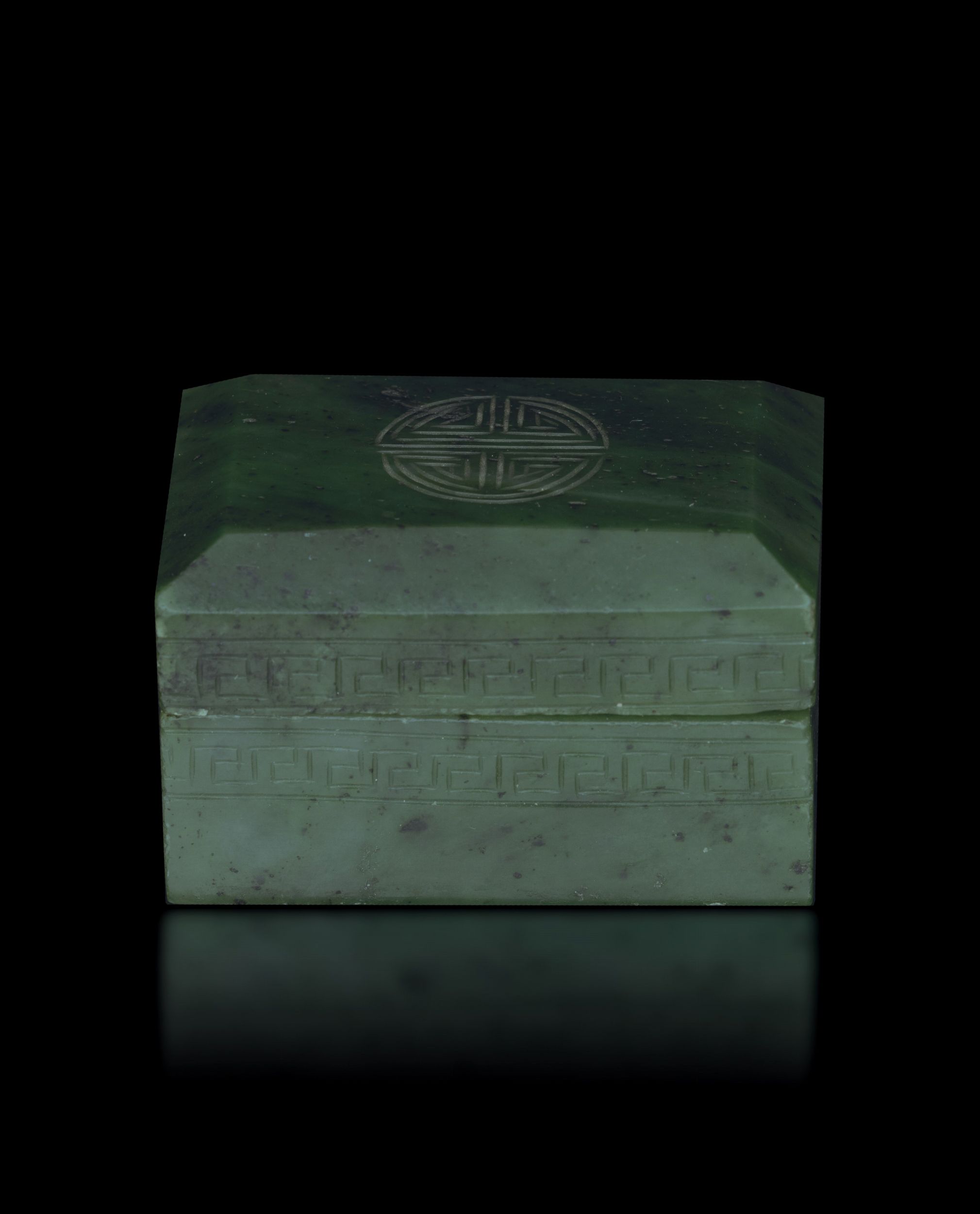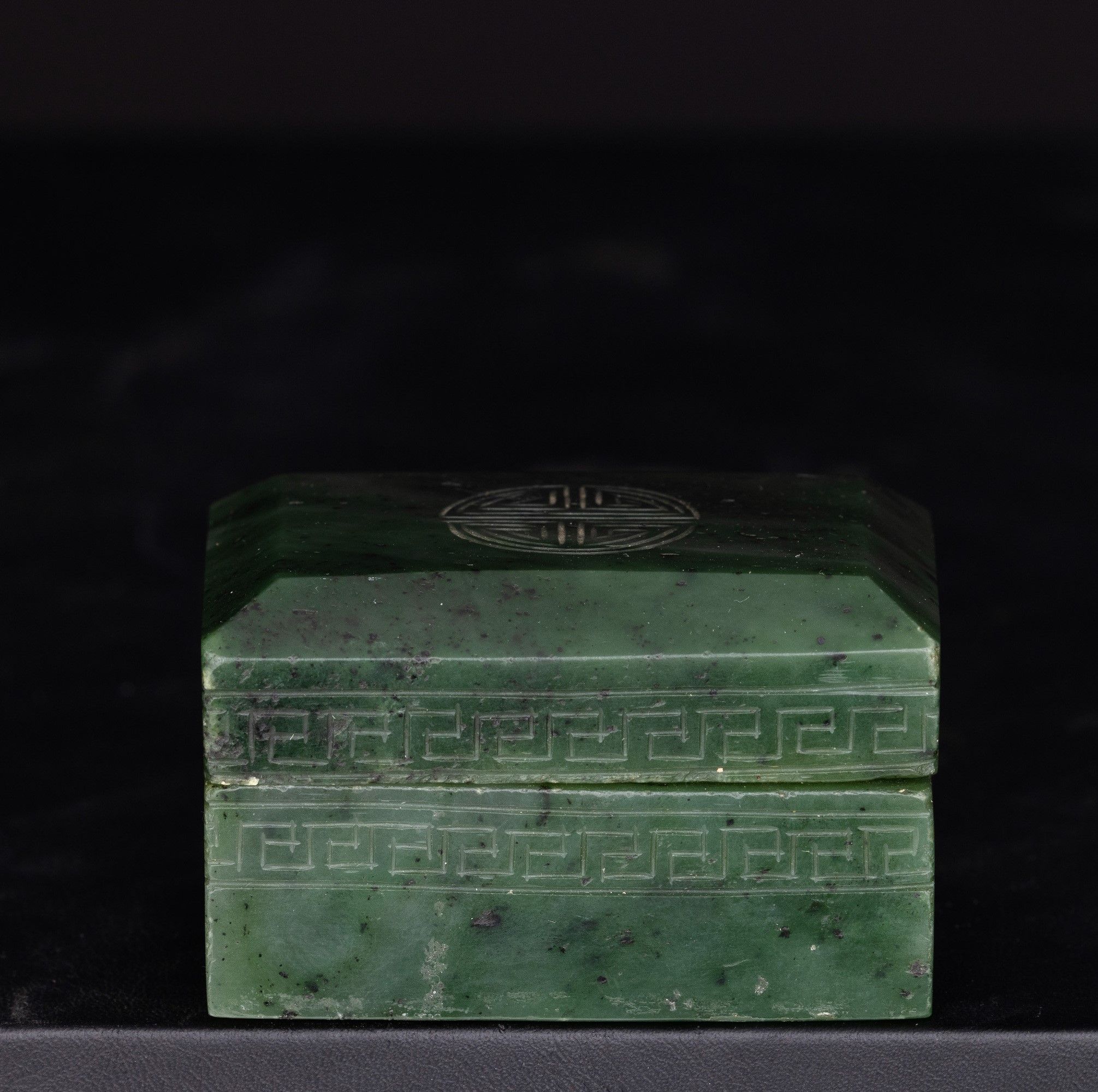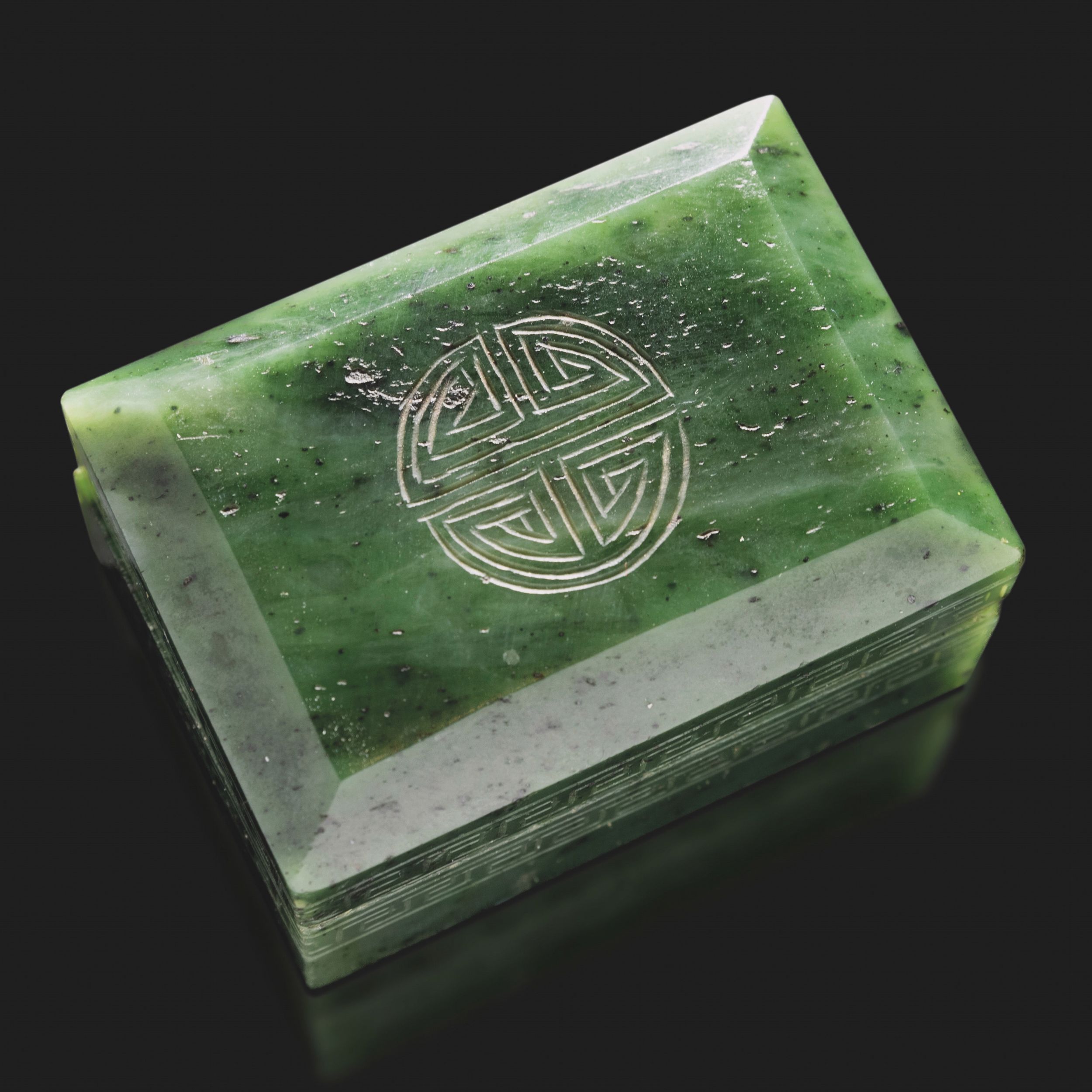 Scatola in giada verde spinacio con greca incisa sui bordi, Cina, Dinastia Qing, [..]