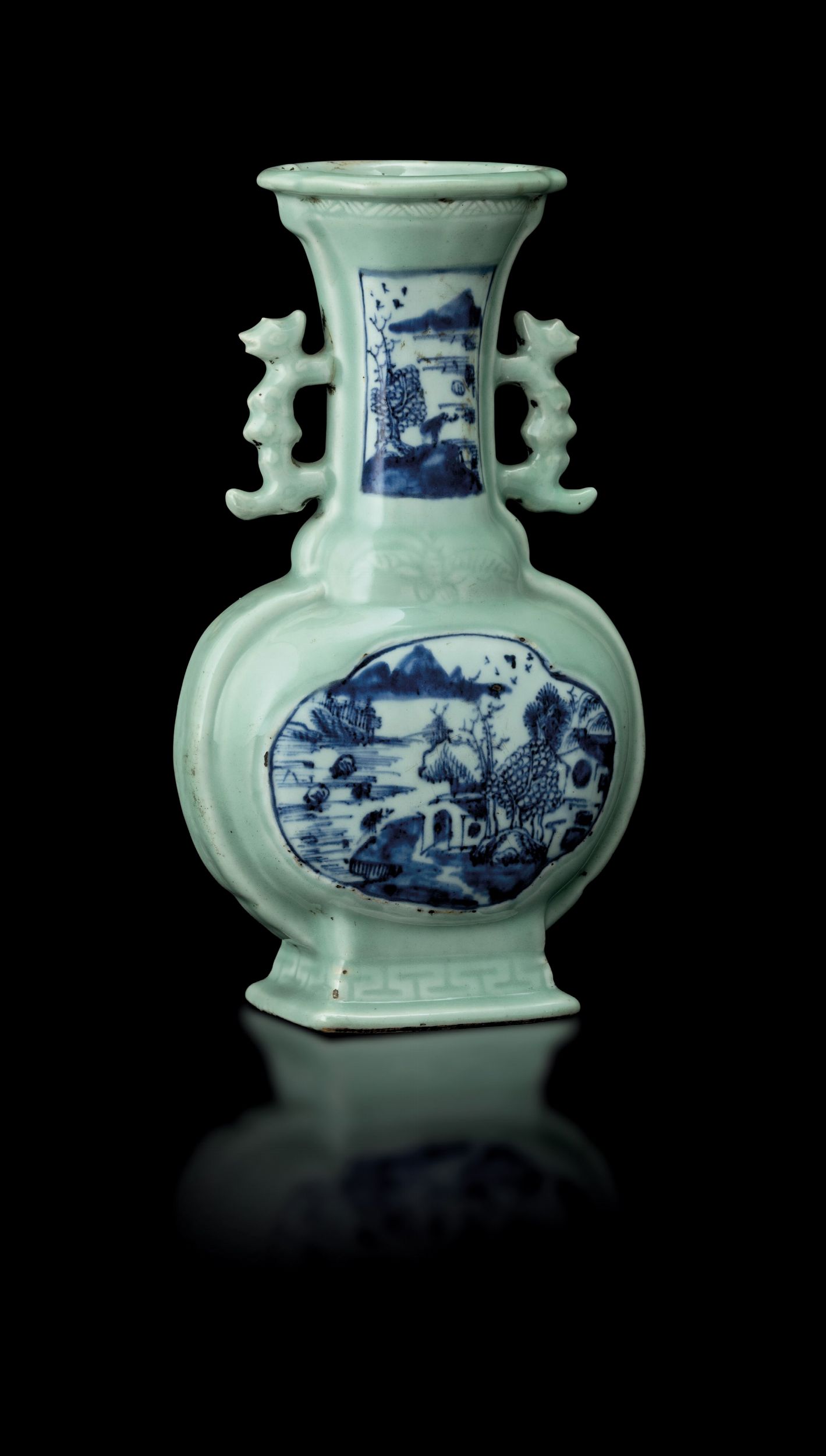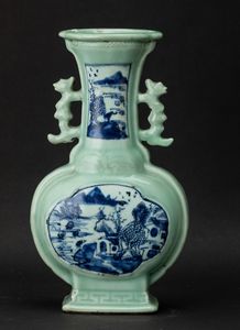 Vaso in porcellana Celadon con anse sagomate e raffigurazioni di paesaggio sui toni [..]