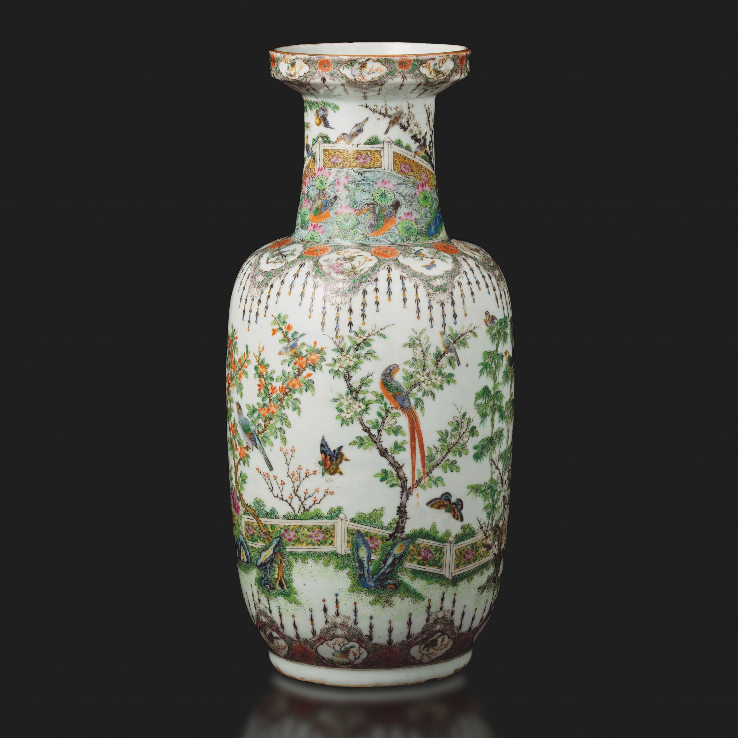 Vaso in porcellana Famiglia Verde raffigurante paesaggio con uccelli e farfalle, [..]