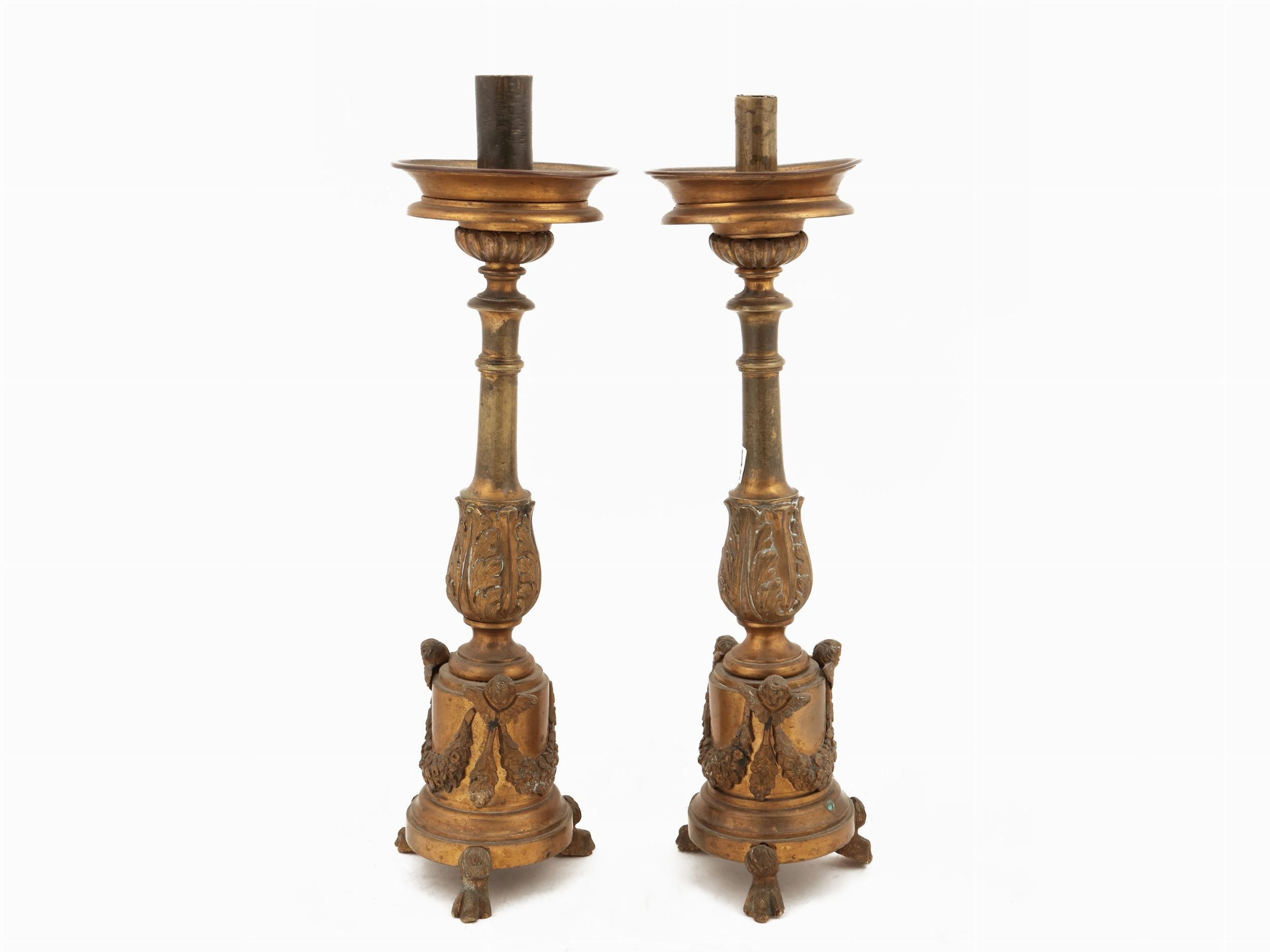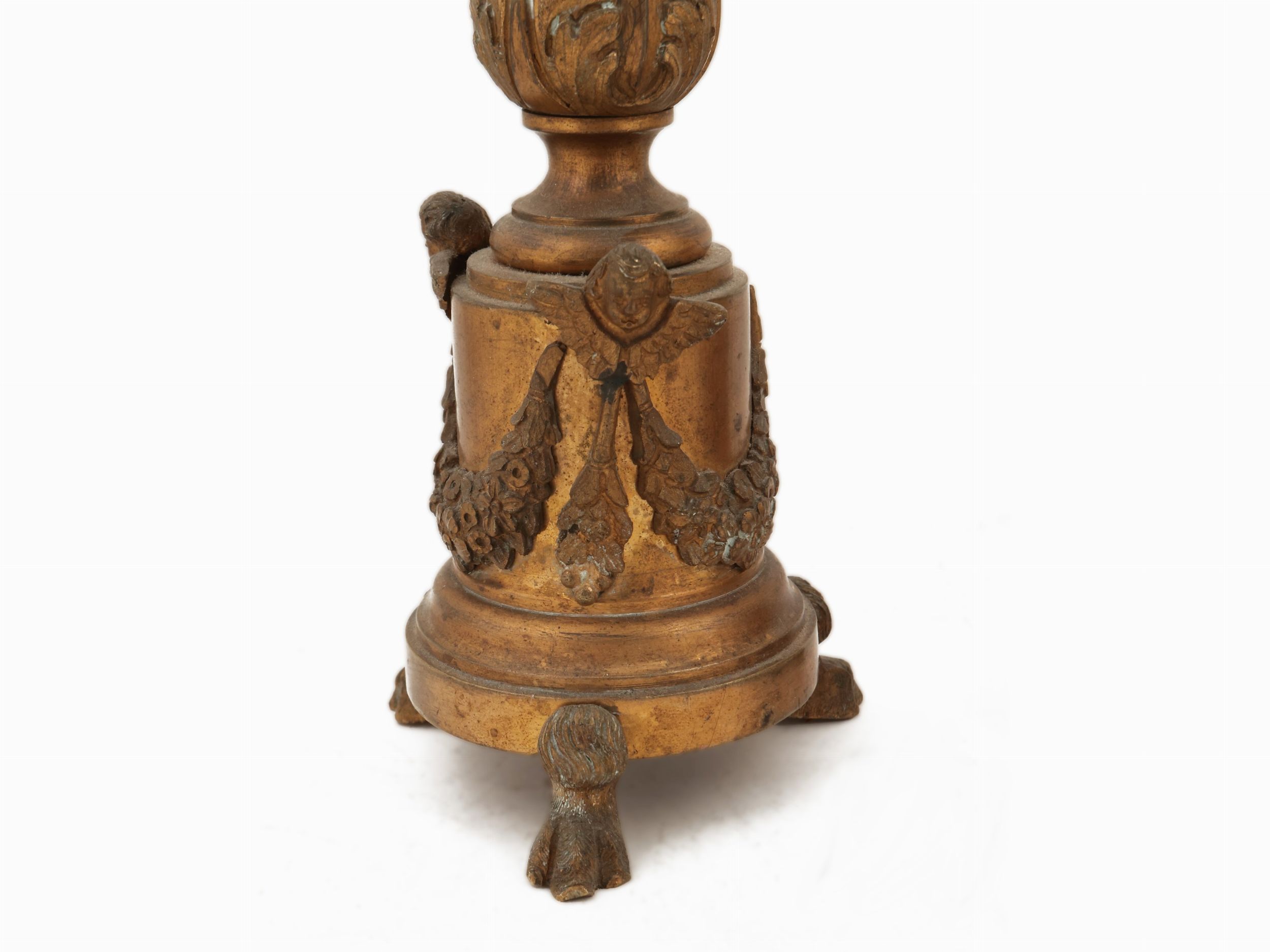 cm 41x48, h cm 30 (3) XVIII secolo cimasa centrata da cartiglio tra volute contrapposte e foglie d'acanto ricadenti anche ai lati, abbinato ad una coppia di candelieri in metallo dorato, fusto sbalzato con foglie d'acanto su base a plinto decorato con festoni e cherubini, alcuni difetti
