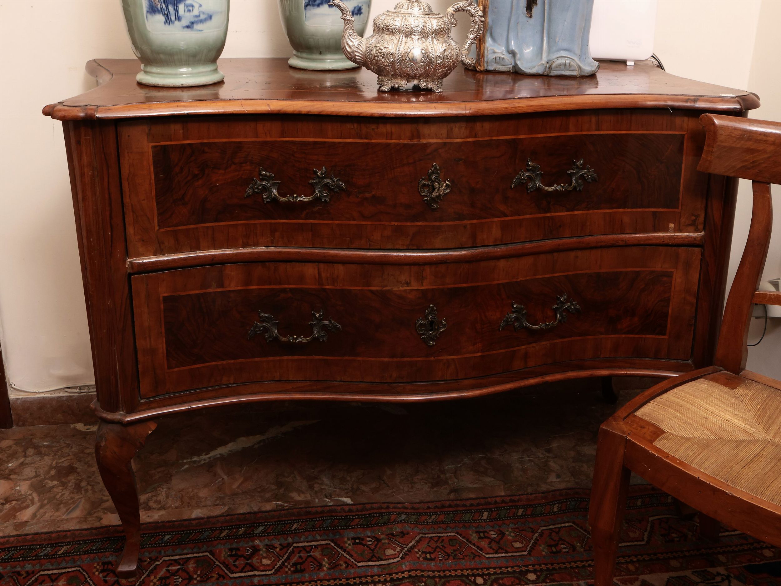 h cm 89x120x55 seconda metà del XVIII secolo intarsiato con filettature in legno di frutto a formare riserve, piano sagomato, due cassetti sul fronte a doppia mossa, gambe mosse con piedini a zoccolo stilizzato