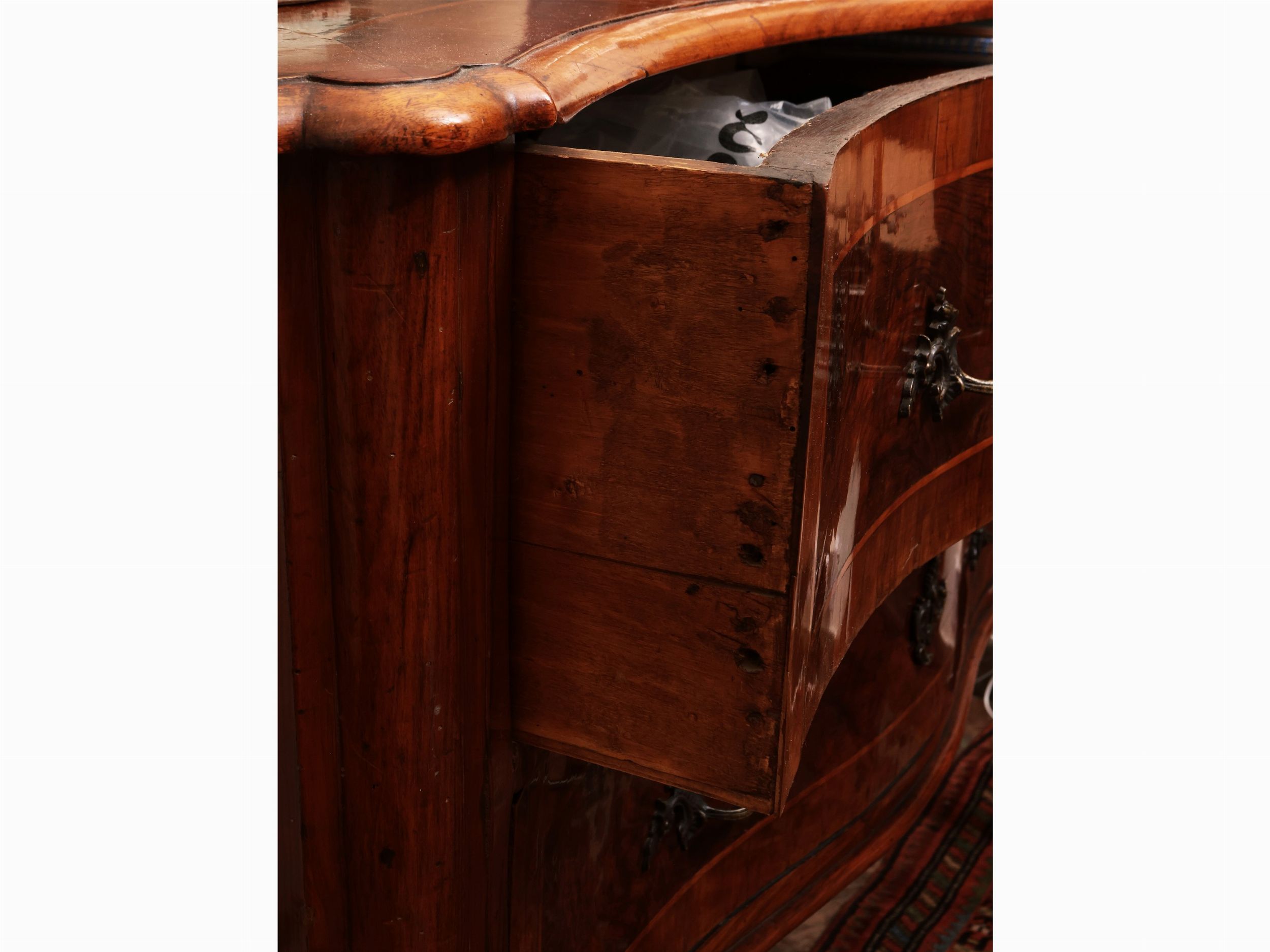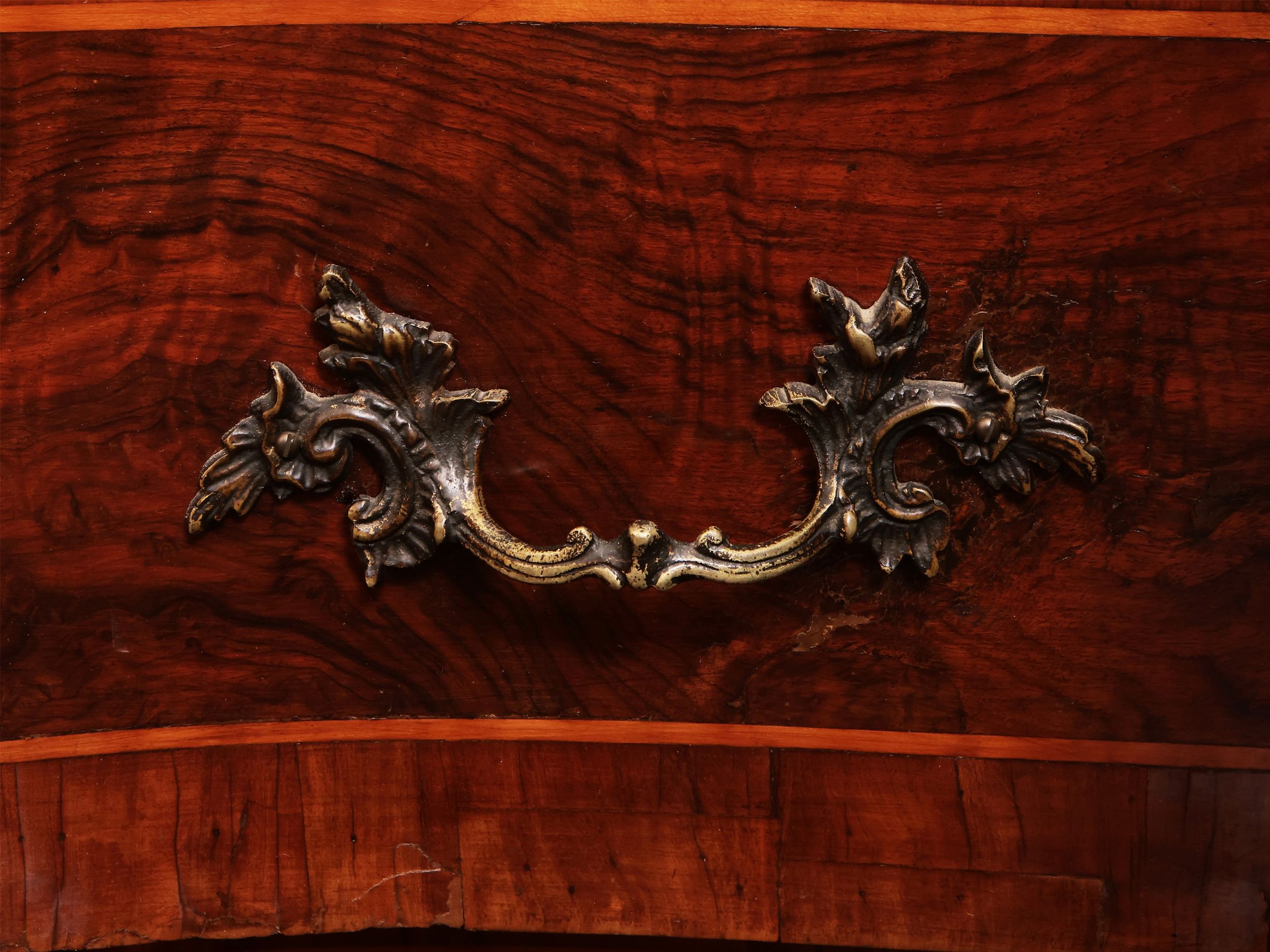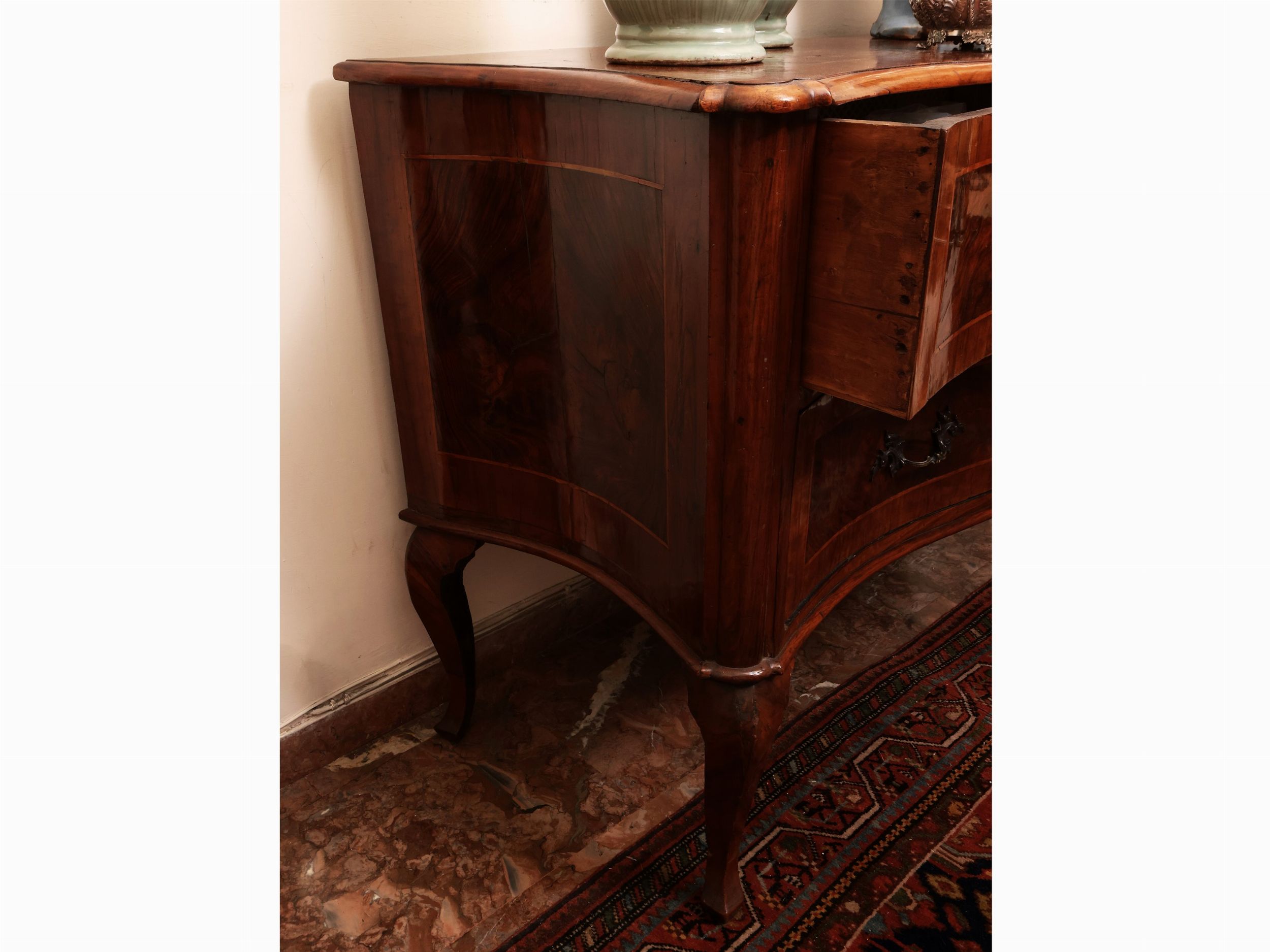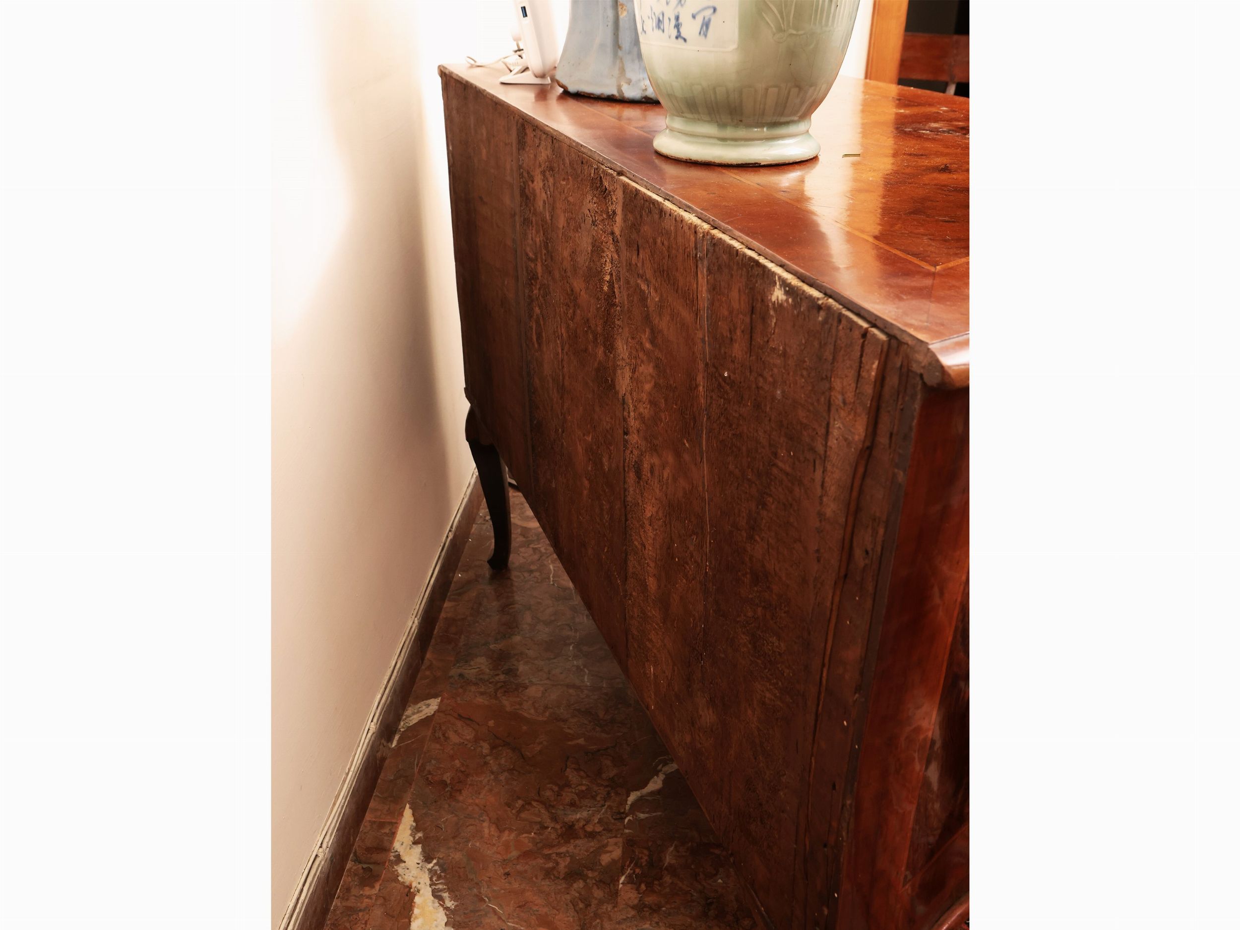 Cassettone a balestra impiallacciato in noce, piuma e radica di noce
