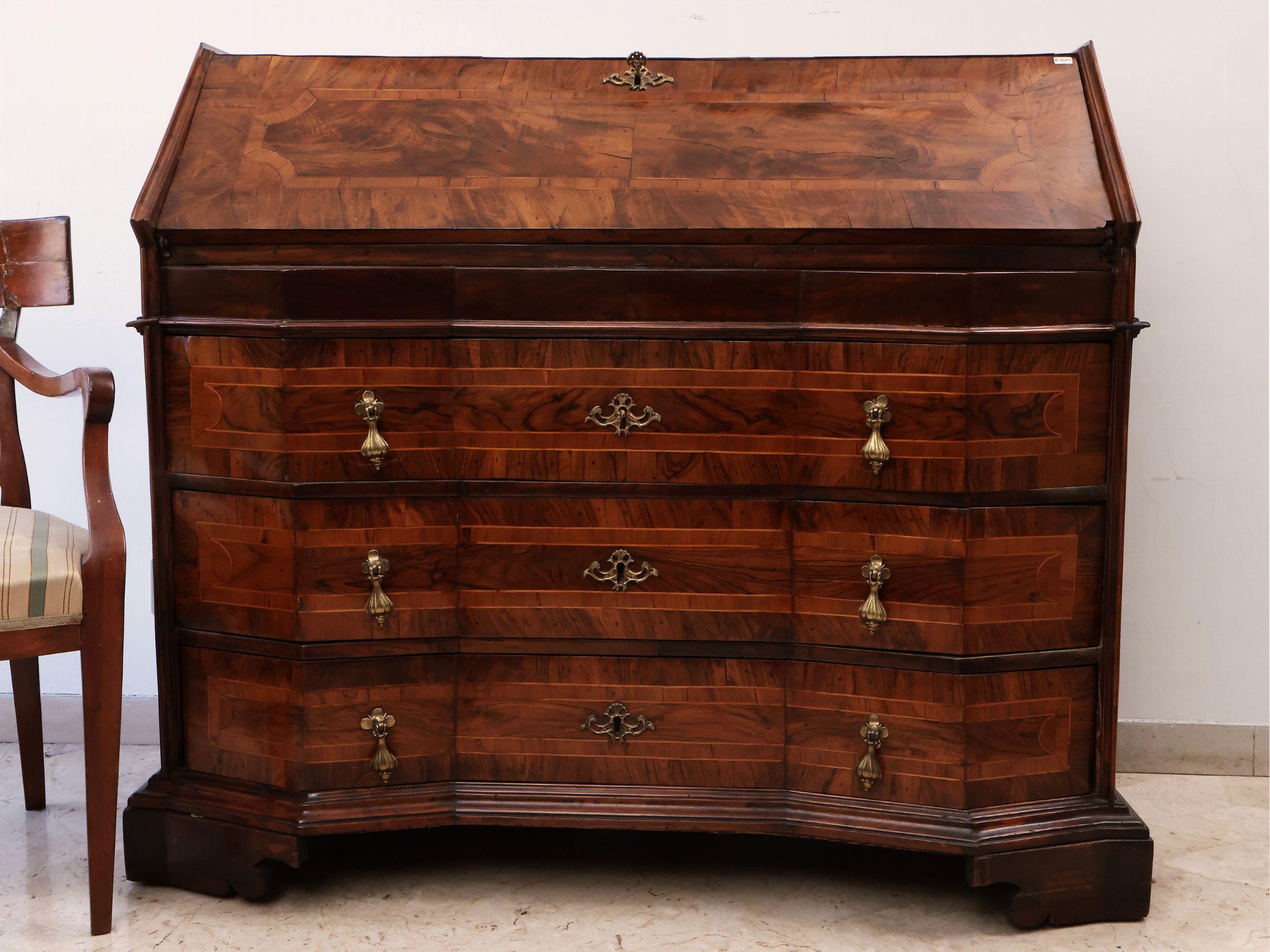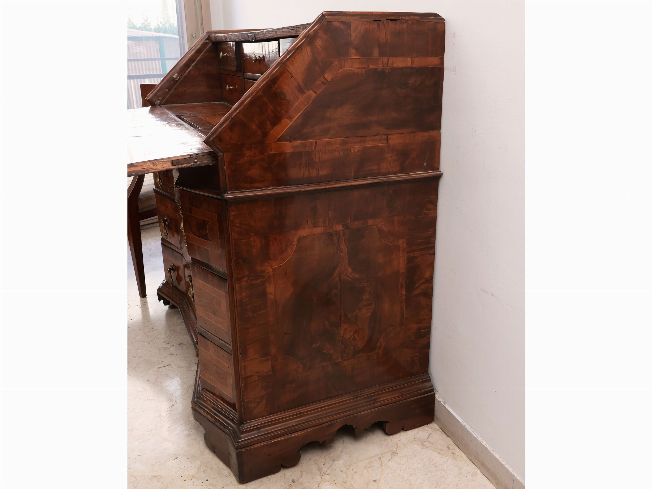 h cm 106x115x56 fine del XVIII secolo intarsiato con filettature in legni di frutto anche sui fianchi dritti, sportello a calatoio a celare scarabattolo con sei cassettini, fronte sagomato a tra cassetti, piedi a mensola