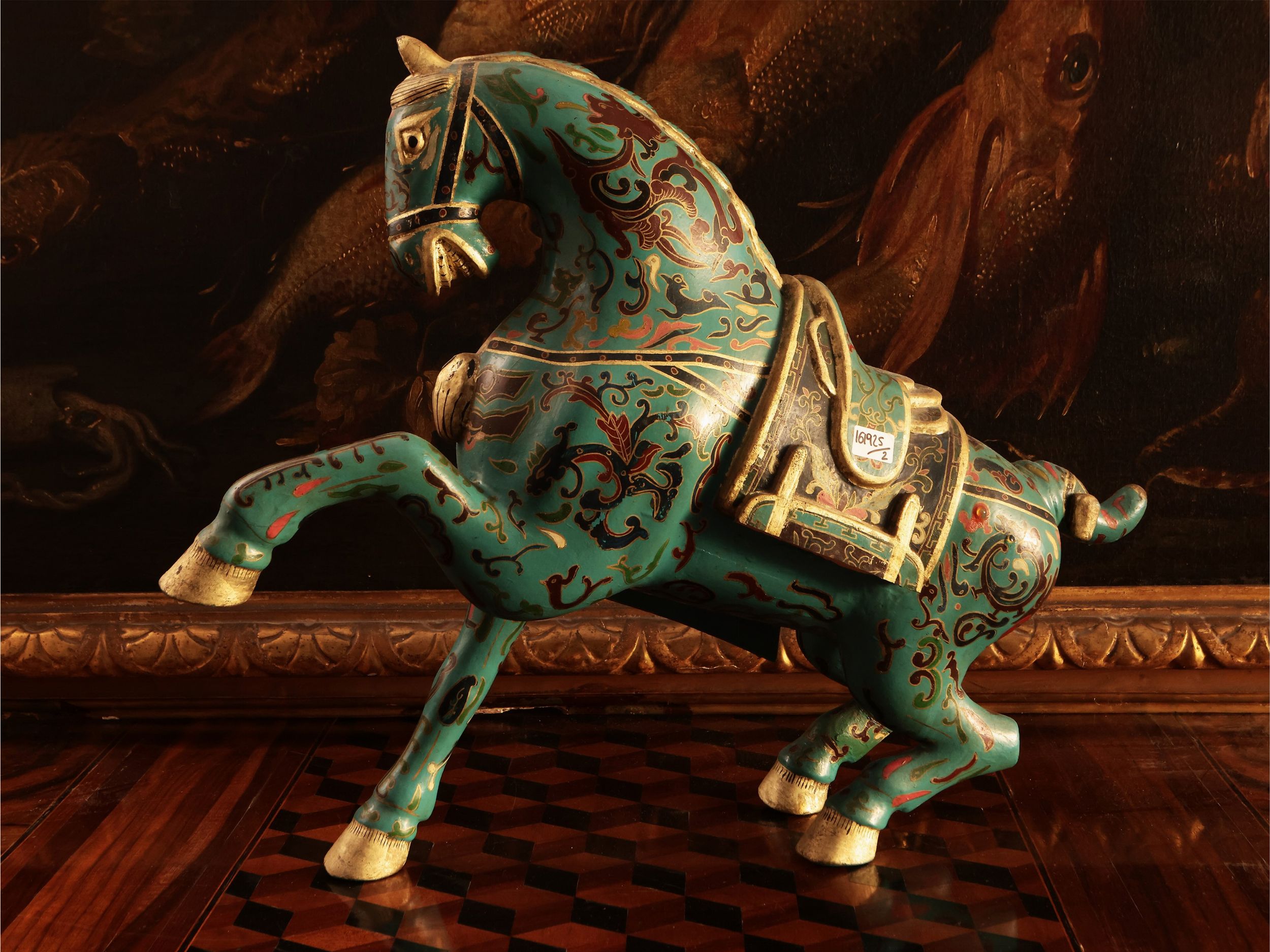 Manifattura orientale, inizio del XX secolo dipinti in policromia ad imitazione degli smalti cloisonné, lumeggiature dorate, lievi difetti ed una mancanza ad un finimento