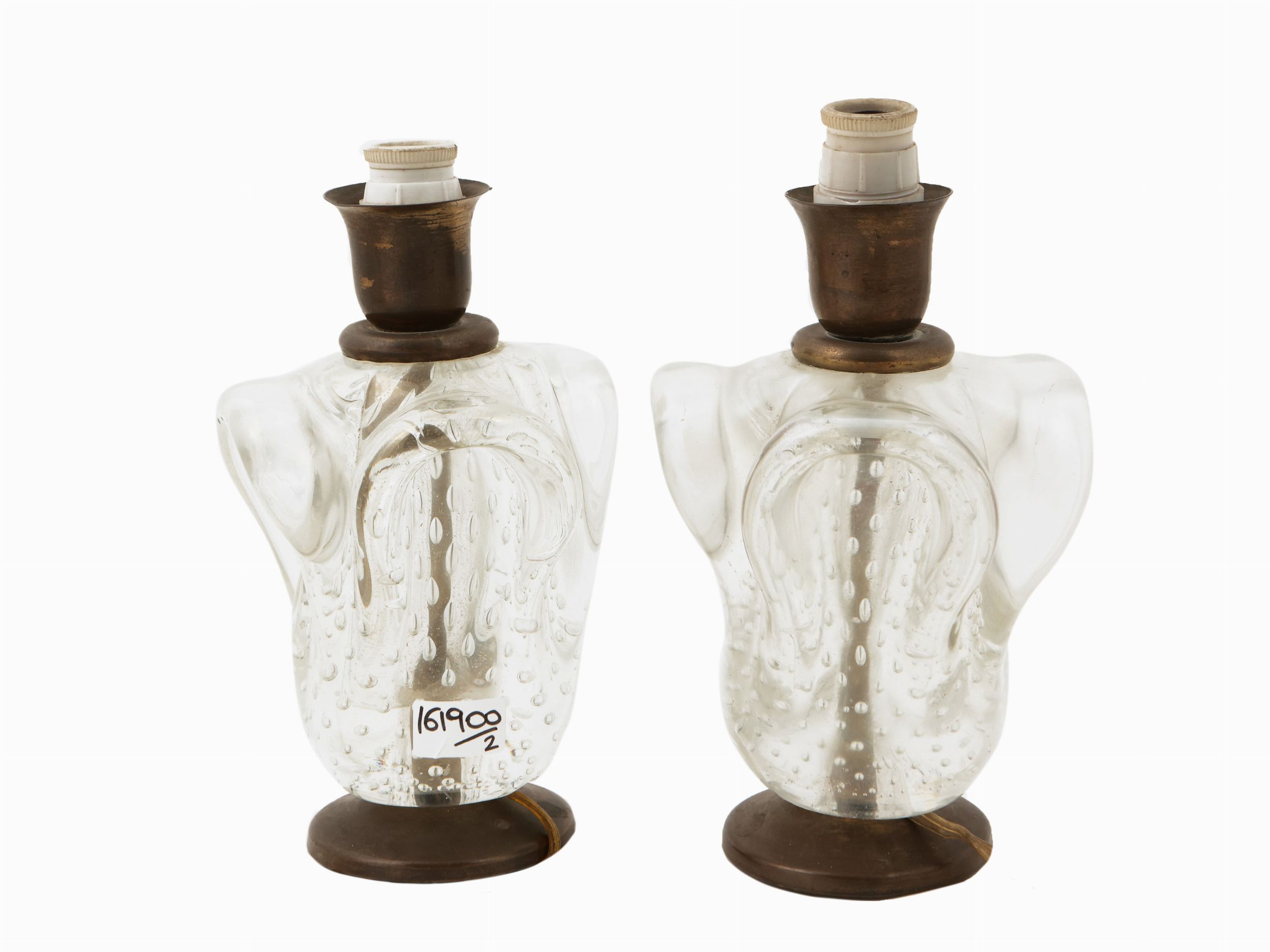 Coppia di piccoli lumi da tavolo in vetro soffiato trasparente