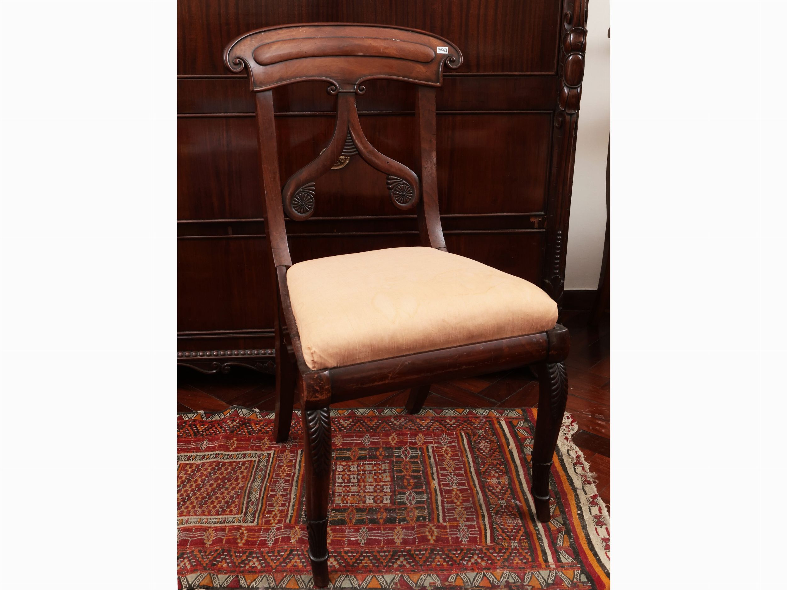 h cm 86x47x40 prima metà del XIX secolo schienale con cartella traforata e intagliata con volute sinuose contrapposte desinenti a rosone, seduta imbottita e rivestita in seta rosa antico, gambe anteriori a voluta, le posteriori a sciabola, lievi difetti