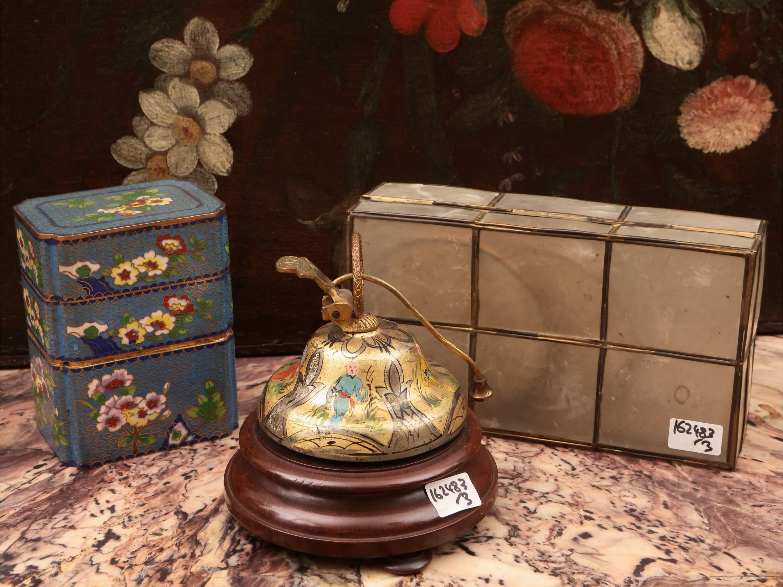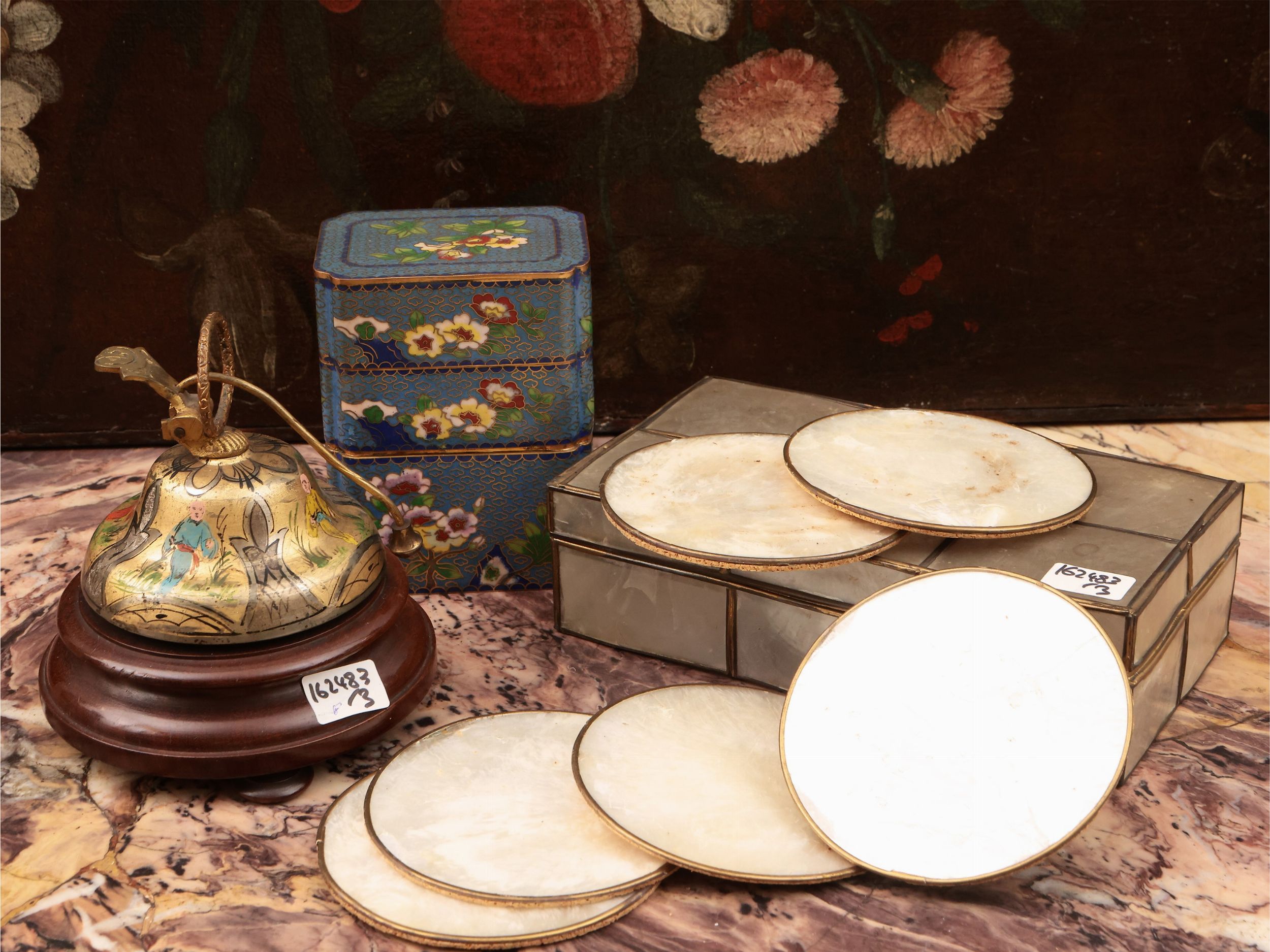 XX secolo composto da una scatola a tre sezioni in smalto cloisonné, un campanello di servizio dipinto a chinoiserie ed una scatola in madreperla contenete sei sottobicchieri