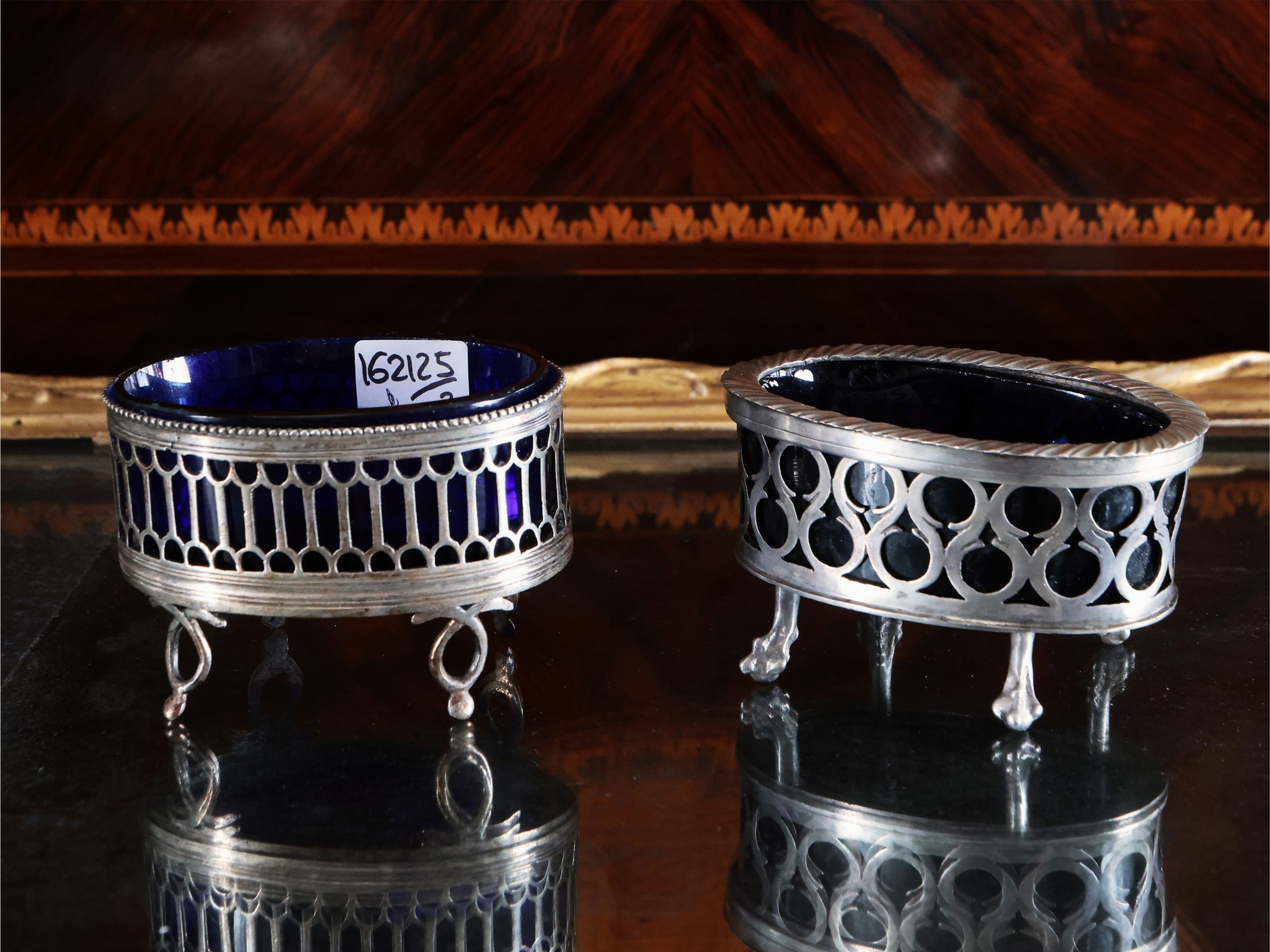 Due saliere in argento con vetro blu