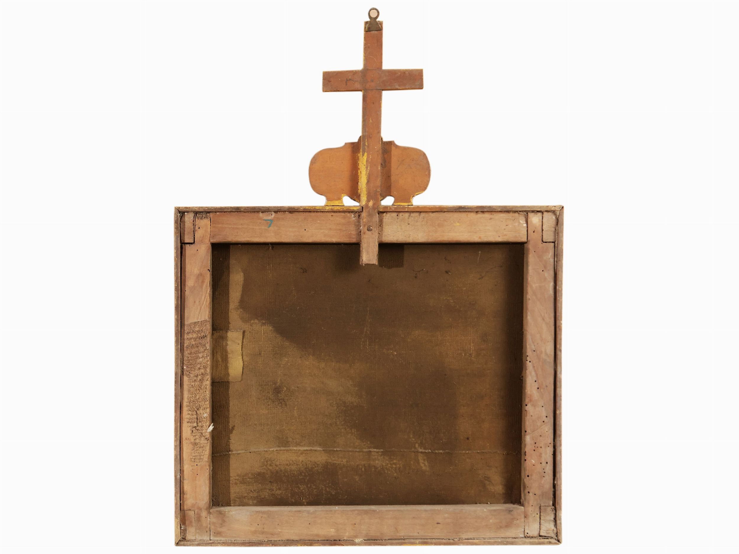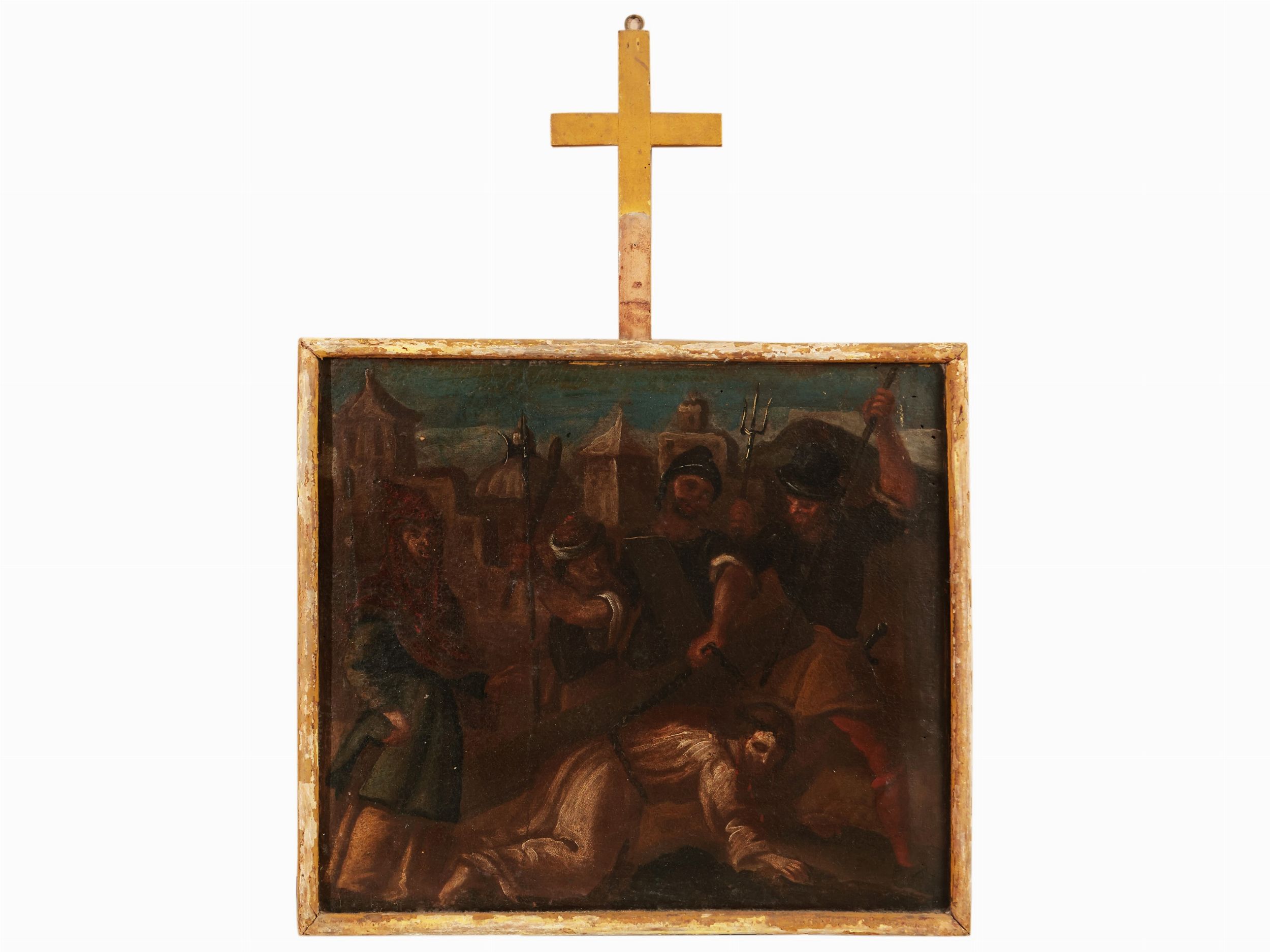coppia di dipinti ad olio su tela, in cornici sormontate da croci