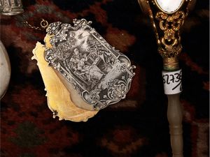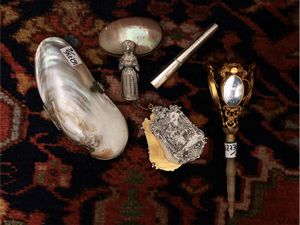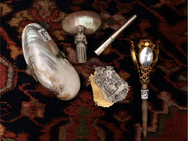 XIX/XX secolo tra cui due scatole realizzate con conchiglie ed un portaaghi a foggia di damigella (6)
