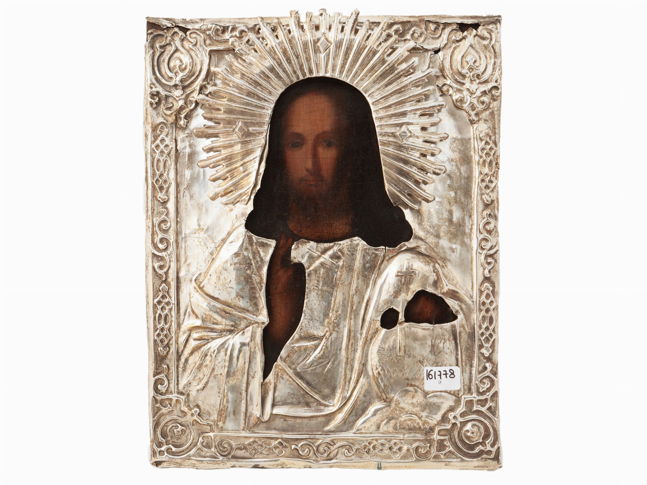 Russia, XIX/XX secolo raffigurante Cristo Pantocratore, tempera su tavola, alcuni difetti alla ritza