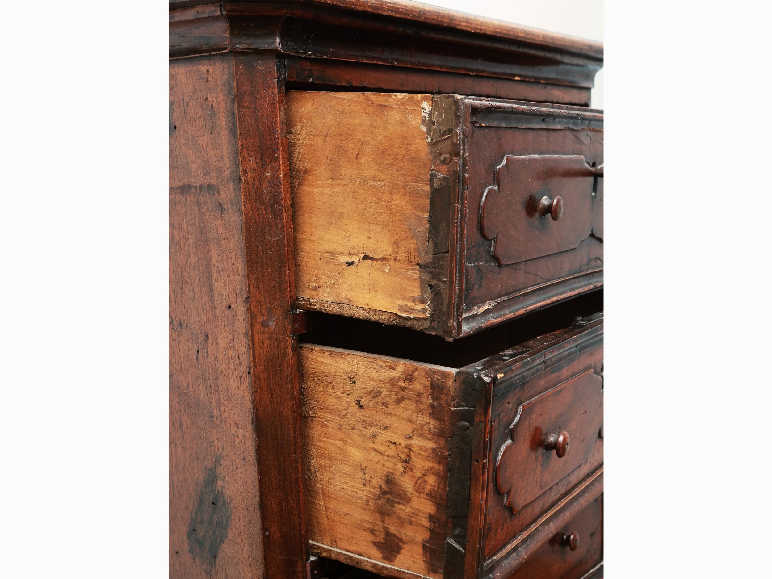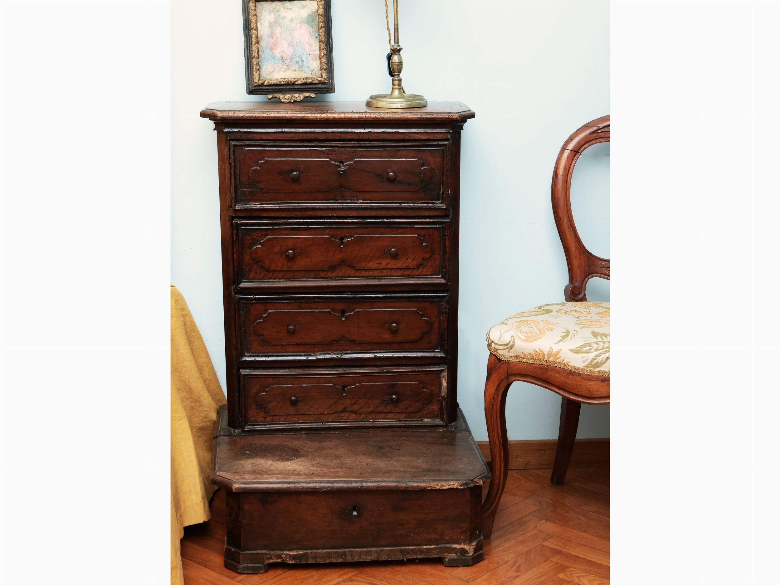 XVIII secolo quattro cassetti con formelle sagomate in rilievo, base a gradino