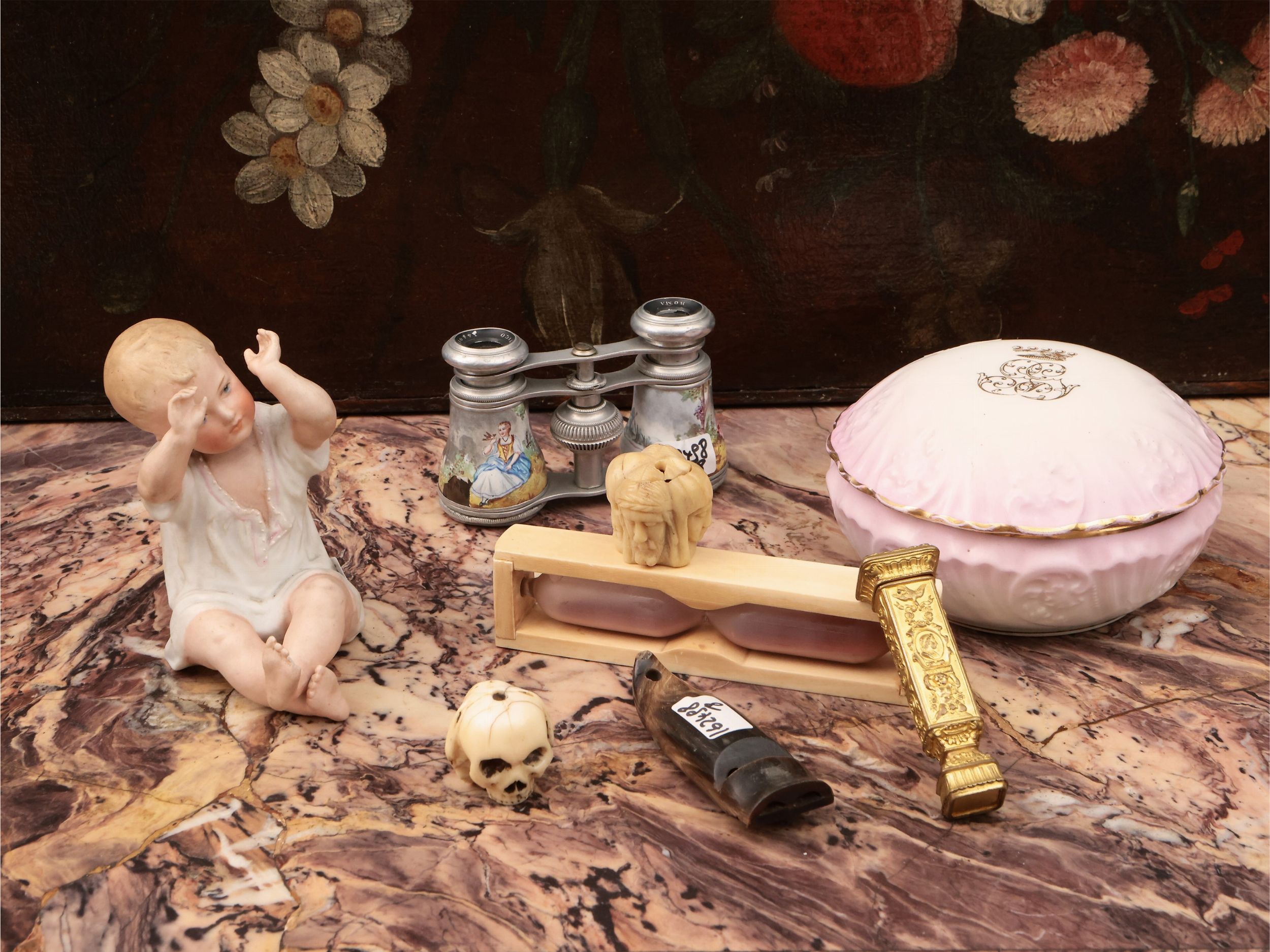 inizio del XX secolo tra cui un binocolo da teatro dipinto con scene galanti, una bomboniera in porcellana Ginori ed un piccolo gruppo in biscuit raffigurante un bebè, alcuni difetti