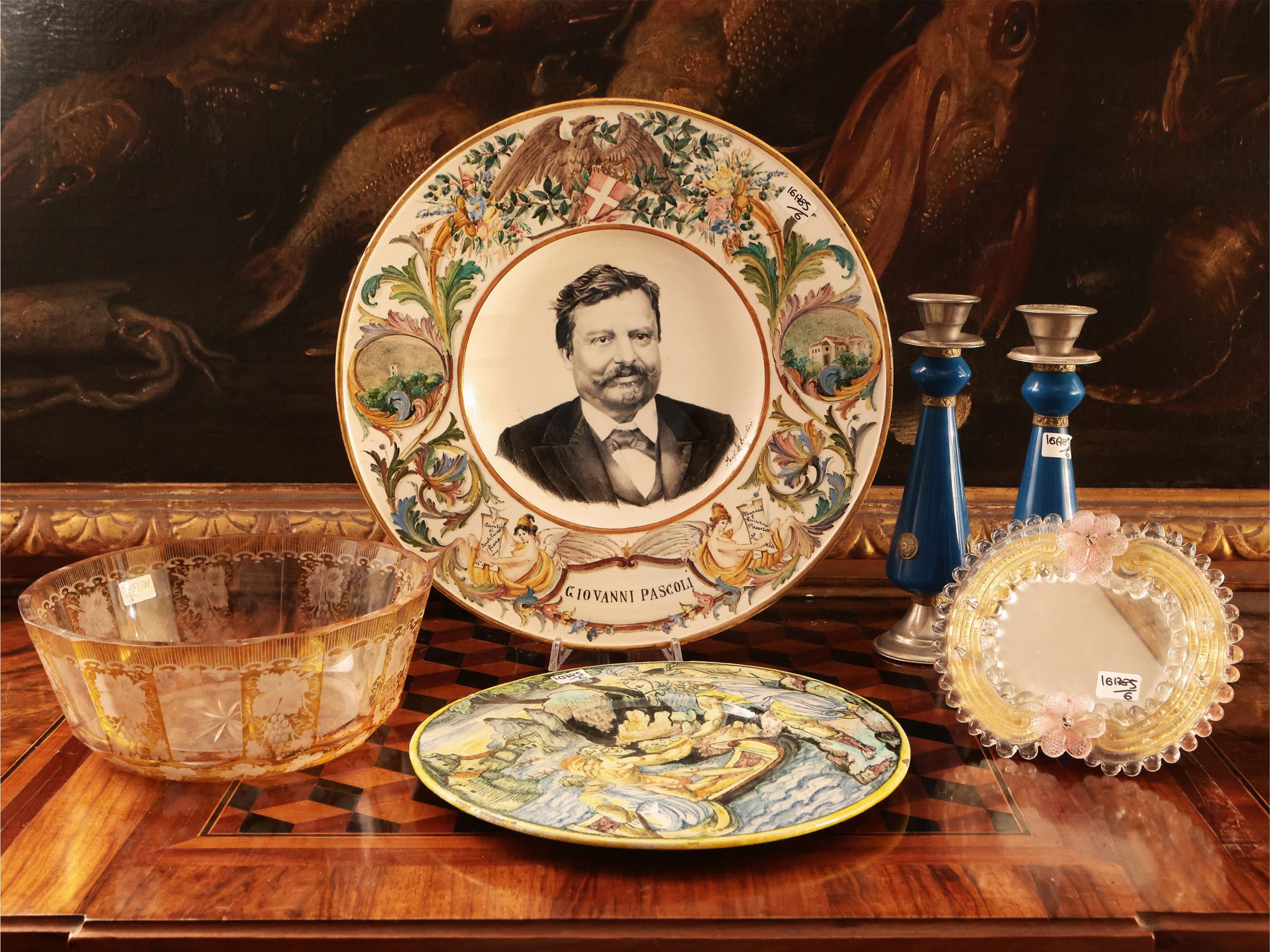 h da cm 9 a cm 23 (6) XIX/XX secolo tra cui un piatto in ceramica commemorativo di Giovanni Pascoli, dipinto dal Prof Matteo Cecchini (forse per l'uscita dei Poemi Conviviali), un piccolo piatto in maiolica ed una piccola specchiera da toilette in vetro di Murano, Archimede Seguso