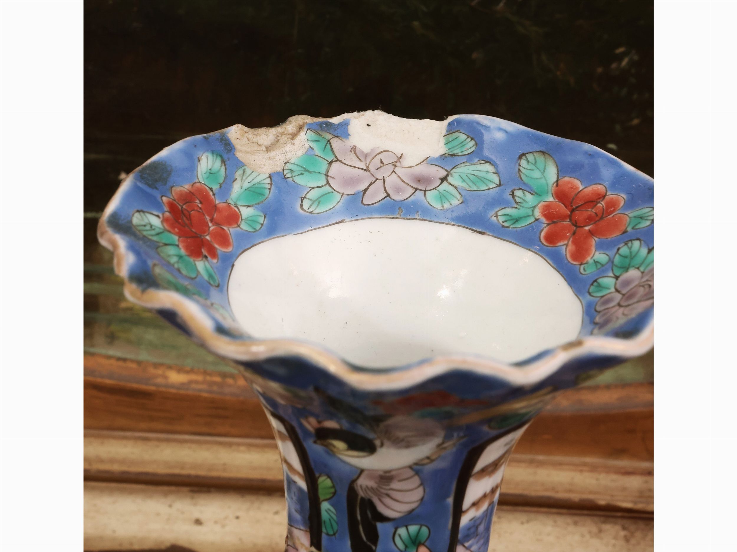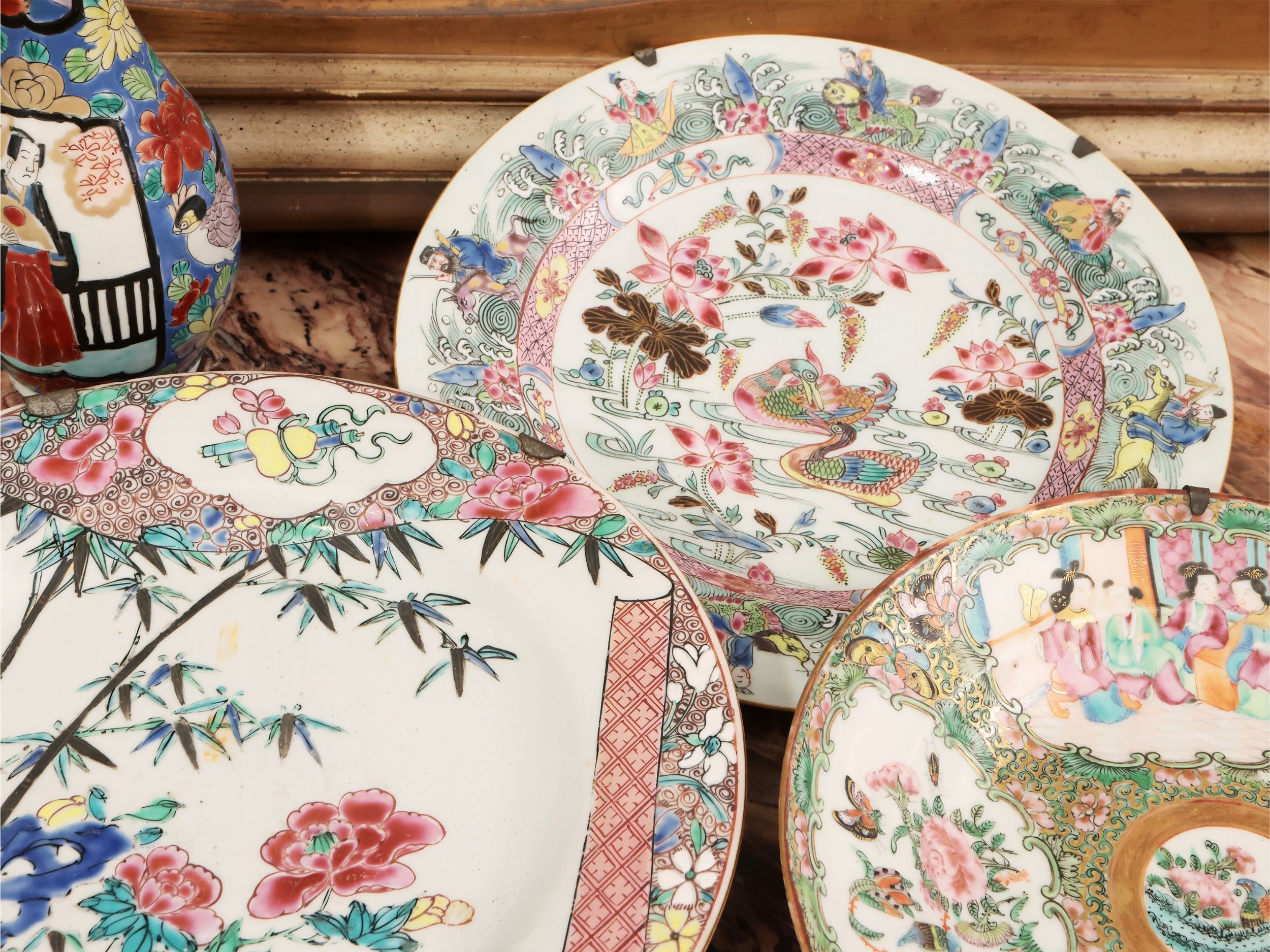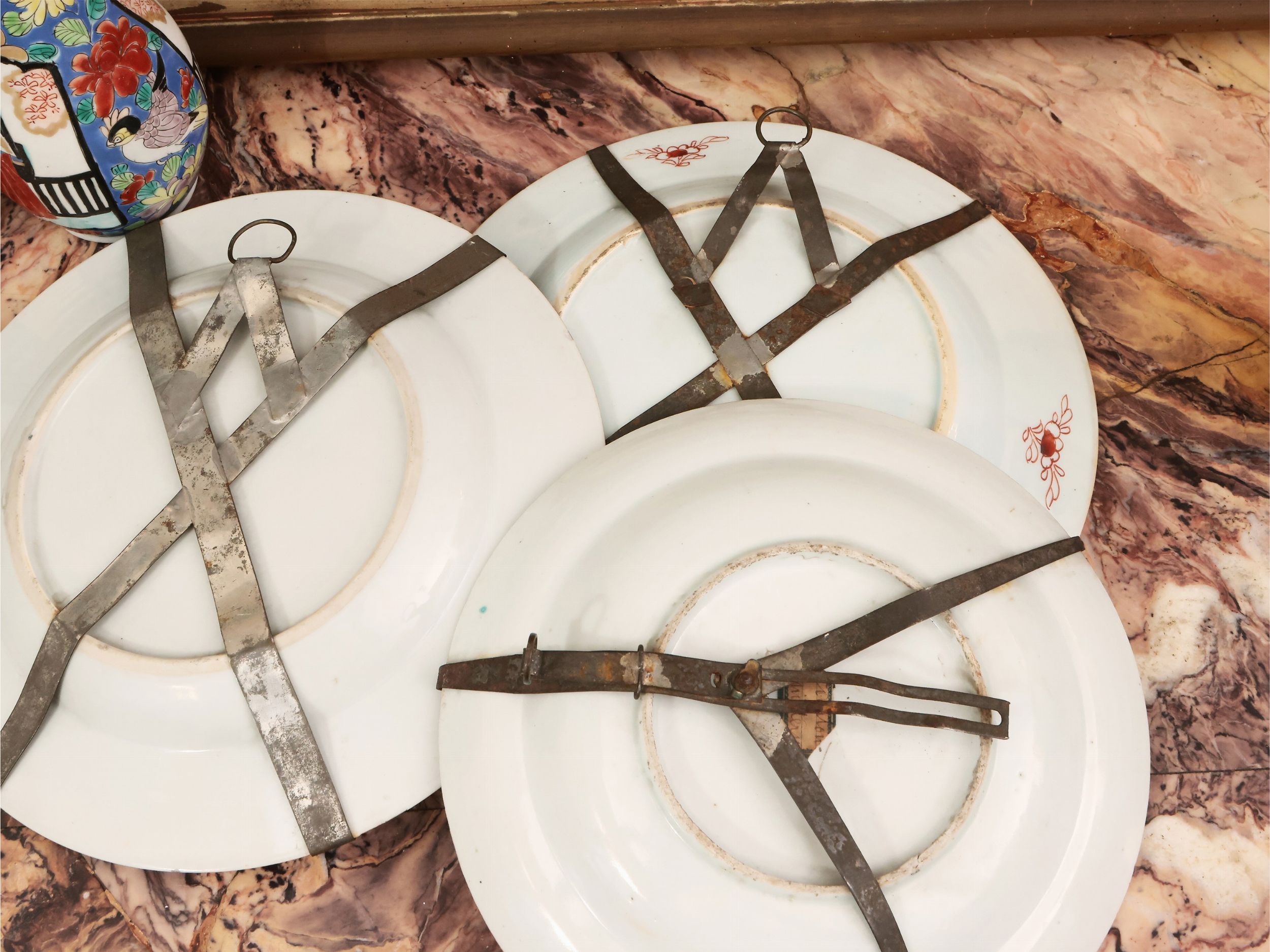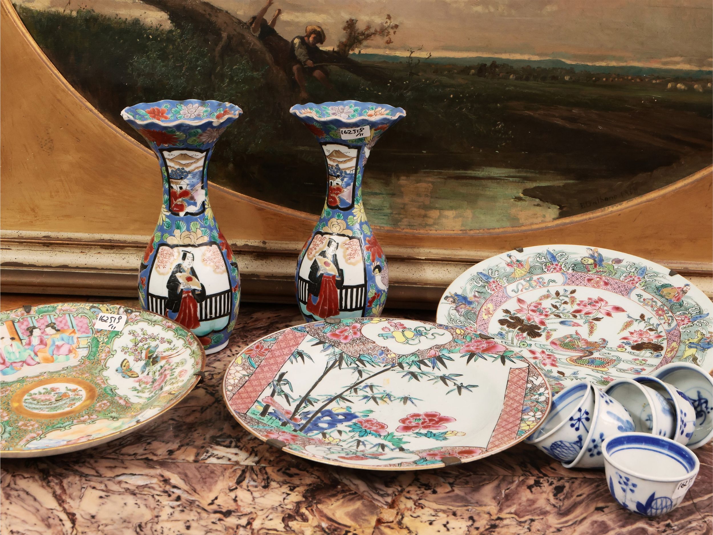 Cina, XIX/XX secolo composto da tre piatti, una coppia di piccoli vasi (uno con restauri e difetti) ed una serie di sei piccole tazze da sakč in monocromia blu