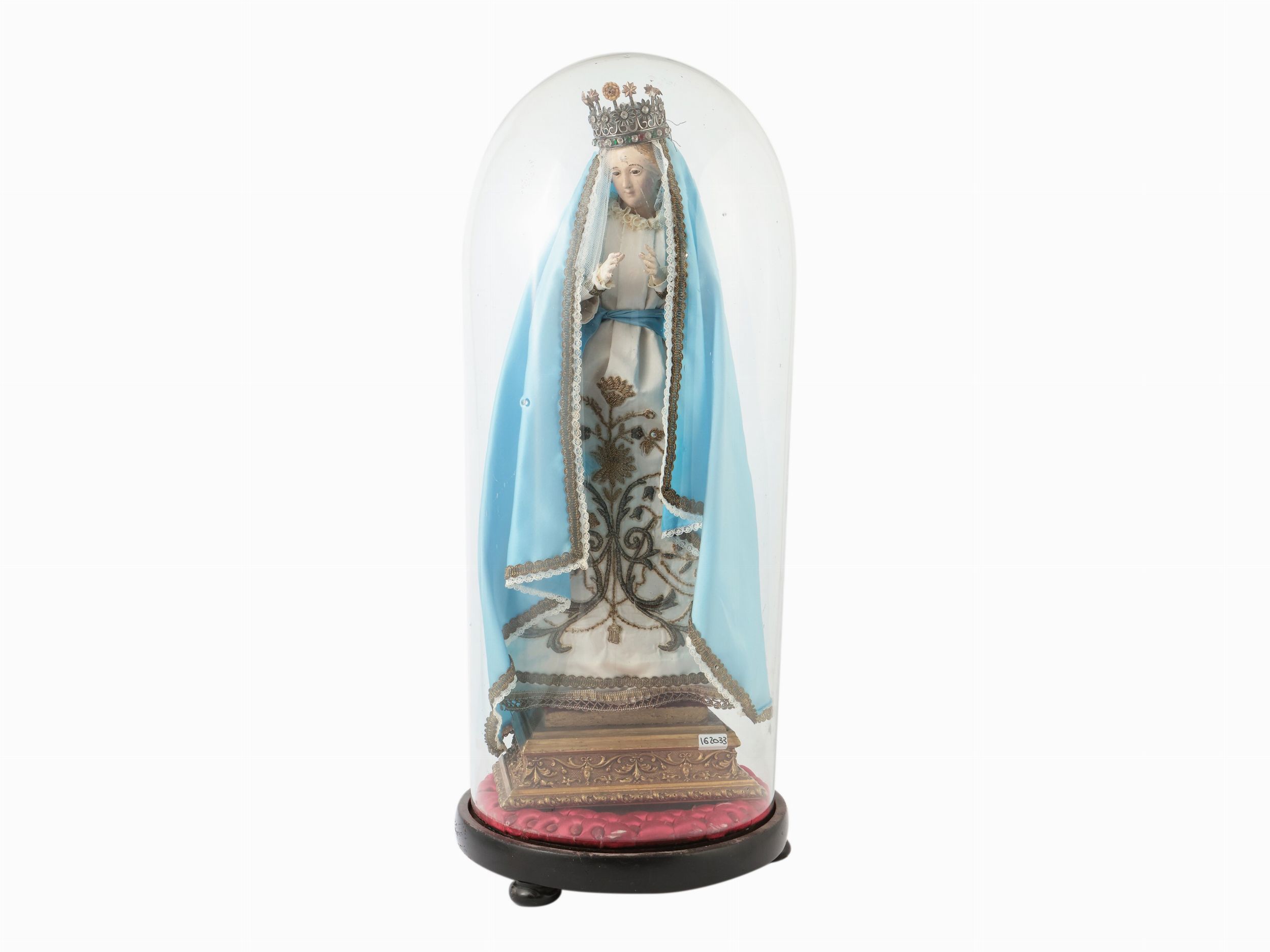 realizzata in terracotta, vesti in seta ricamata con motivo floreale e bordure in gallone dorato, occhi in vetro, entro teca a campana, su base in legno intagliato con volute e dorato, lievi difetti
