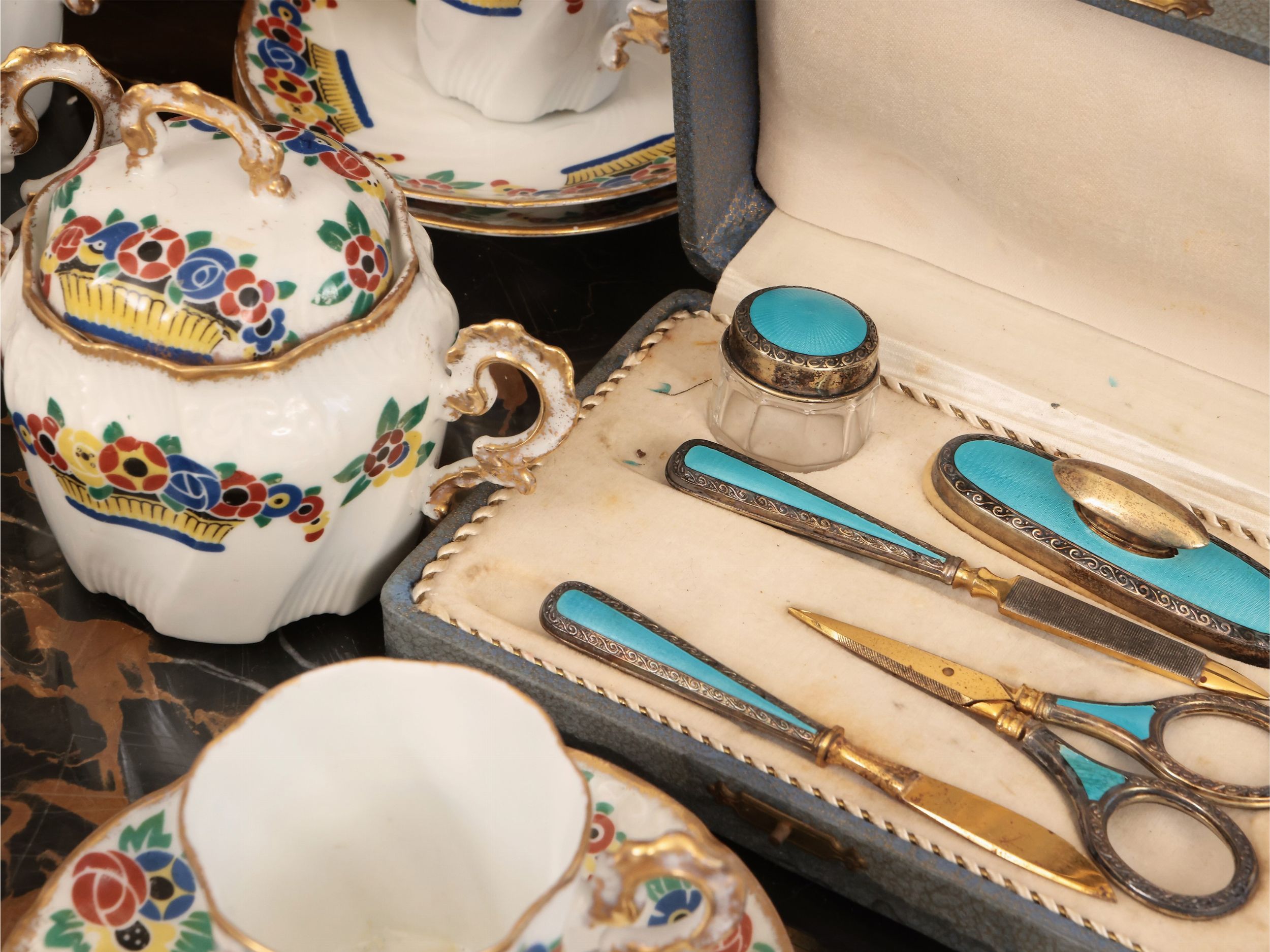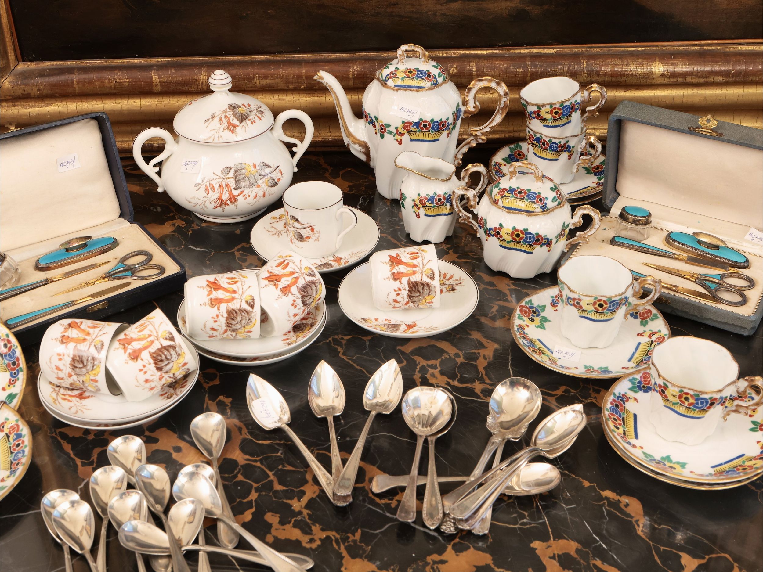 XIX/XX secolo tra cui da un servizio da caffè in porcellana Ginori, inizio del XX secolo, dipinto con motivi autunnali, composto da 6 tazzine ed una zuccheriera, un altro servizio Limoges, una serie di 11 cucchiaini da gelato e due necessaire in smalto, entro astucci originali, alcuni difetti