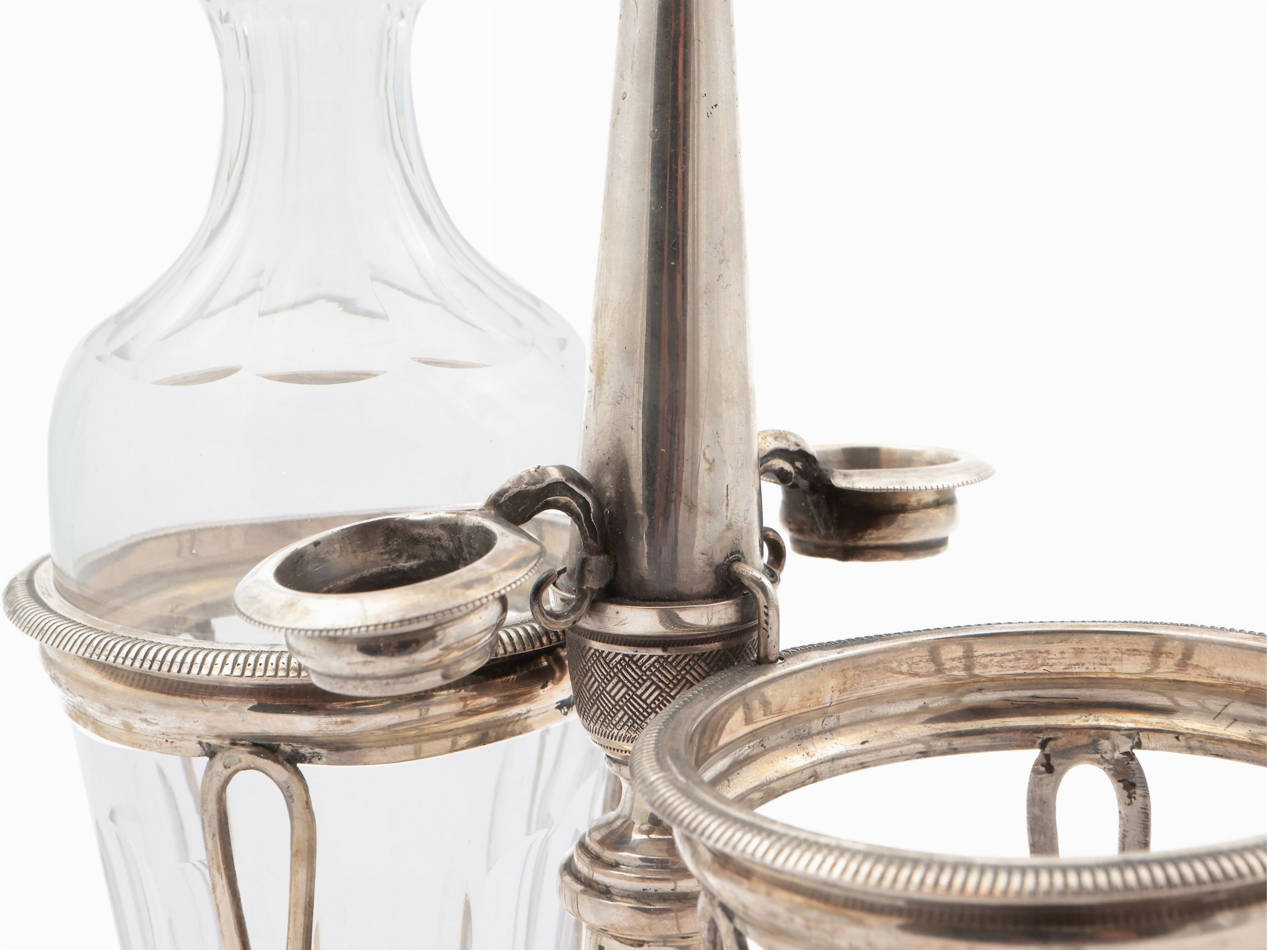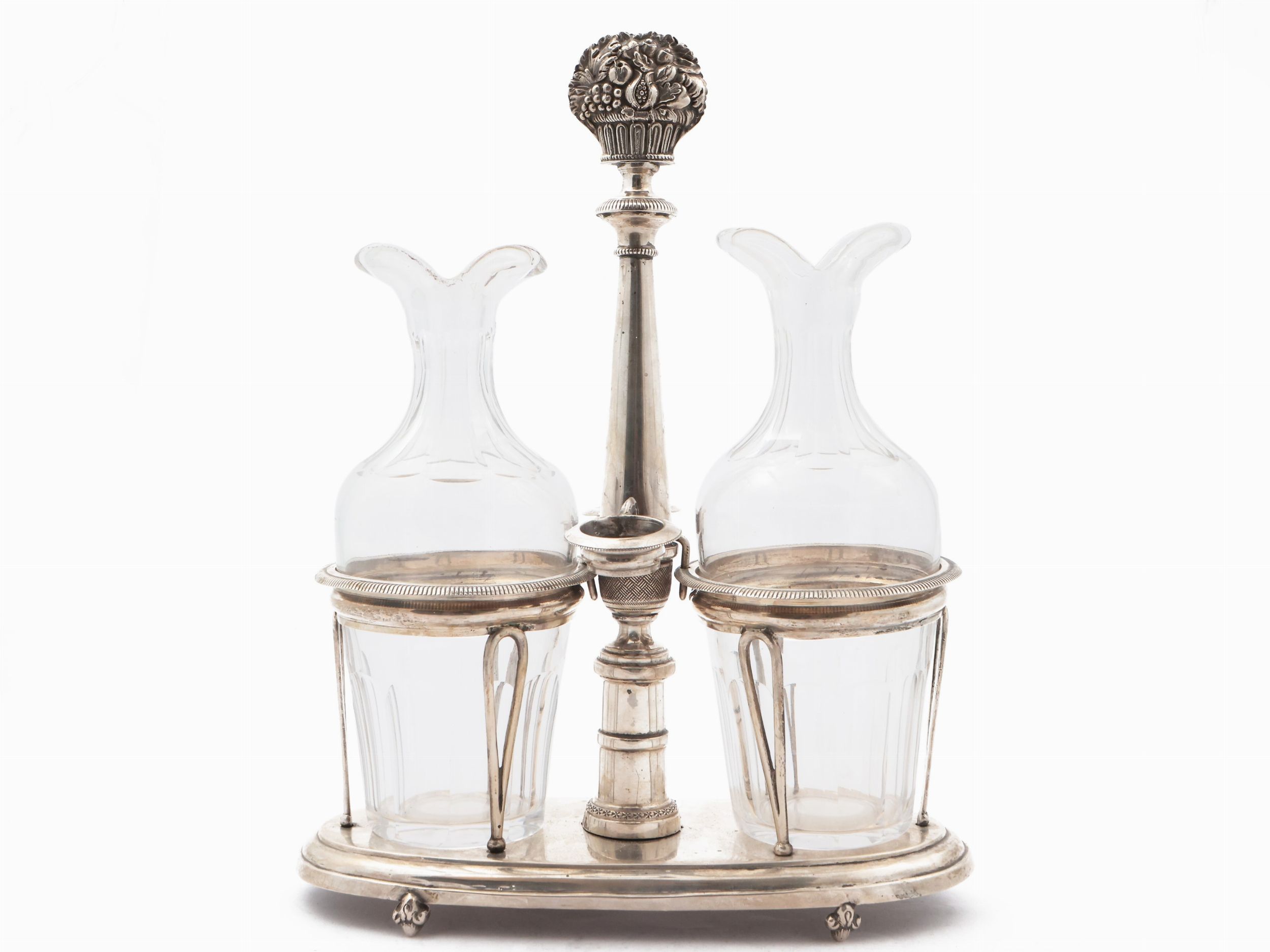 Novara, XIX secolo base ovale, presa centrale sormontata da cesti di frutti e melegrane, ampolle prive di tappi