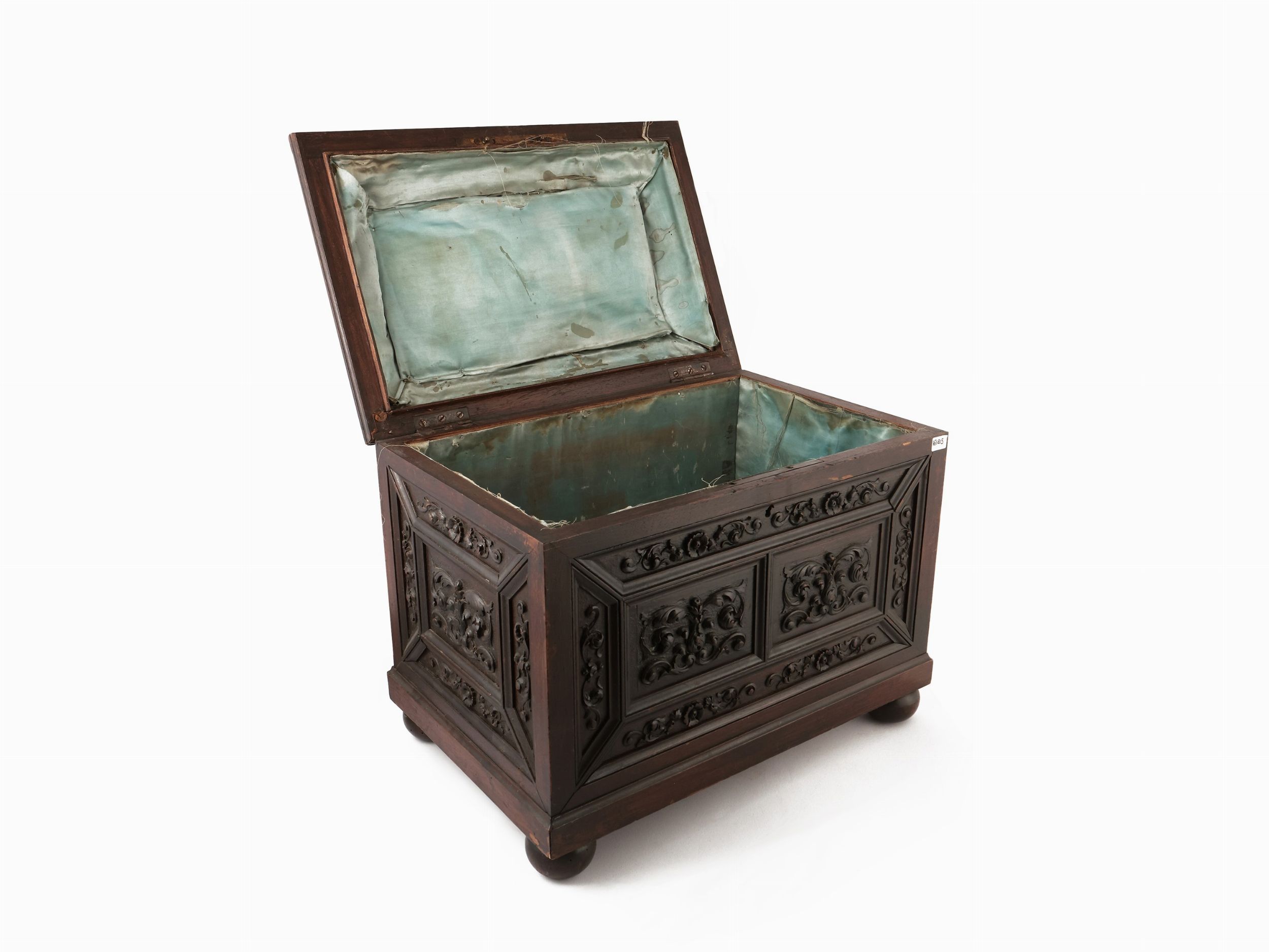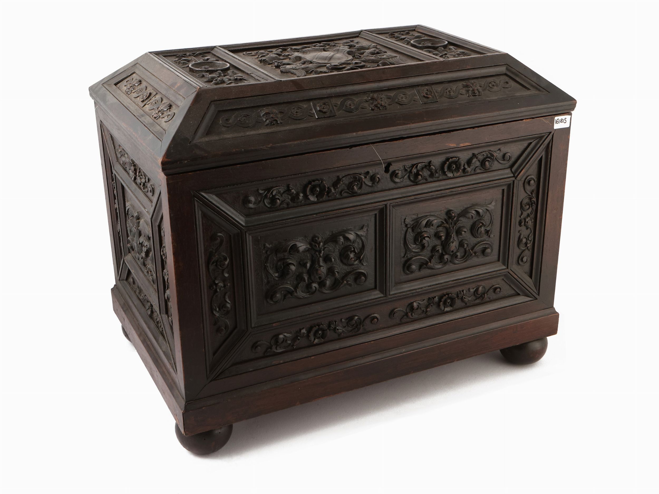 fine del XIX secolo coperchio centrato da stemma, interamente intagliato con formelle a volute e girali, piedi a sfera