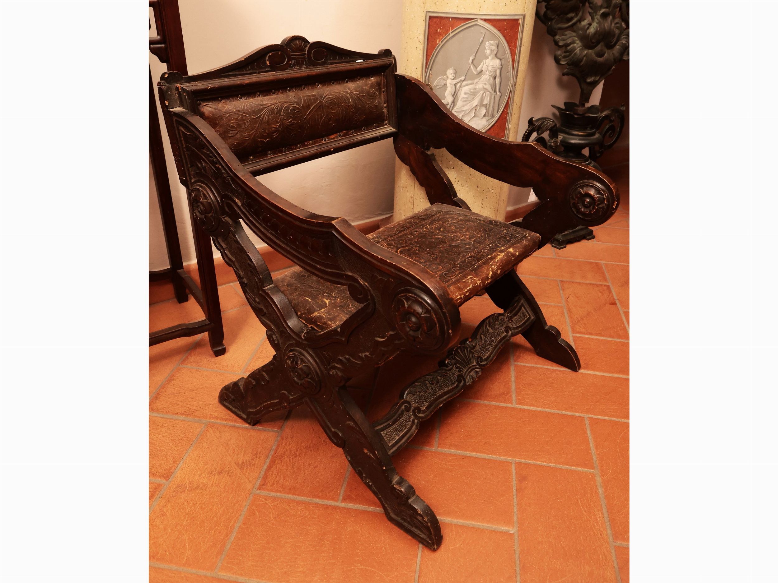 XIX/XX secolo schienale centrato da motivo a conchiglia tra volute contrapposte, intagliata con rosoni e motivi vegetali, seduta in cuoio, braccioli a giorno desinenti a voluta, lievi difetti