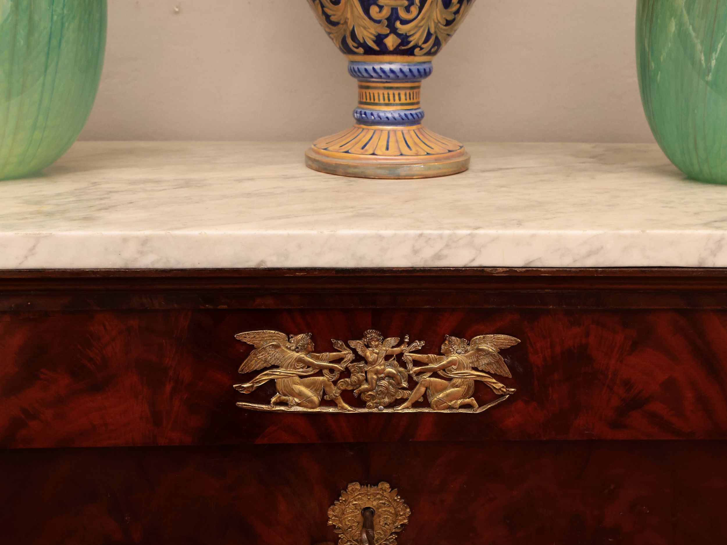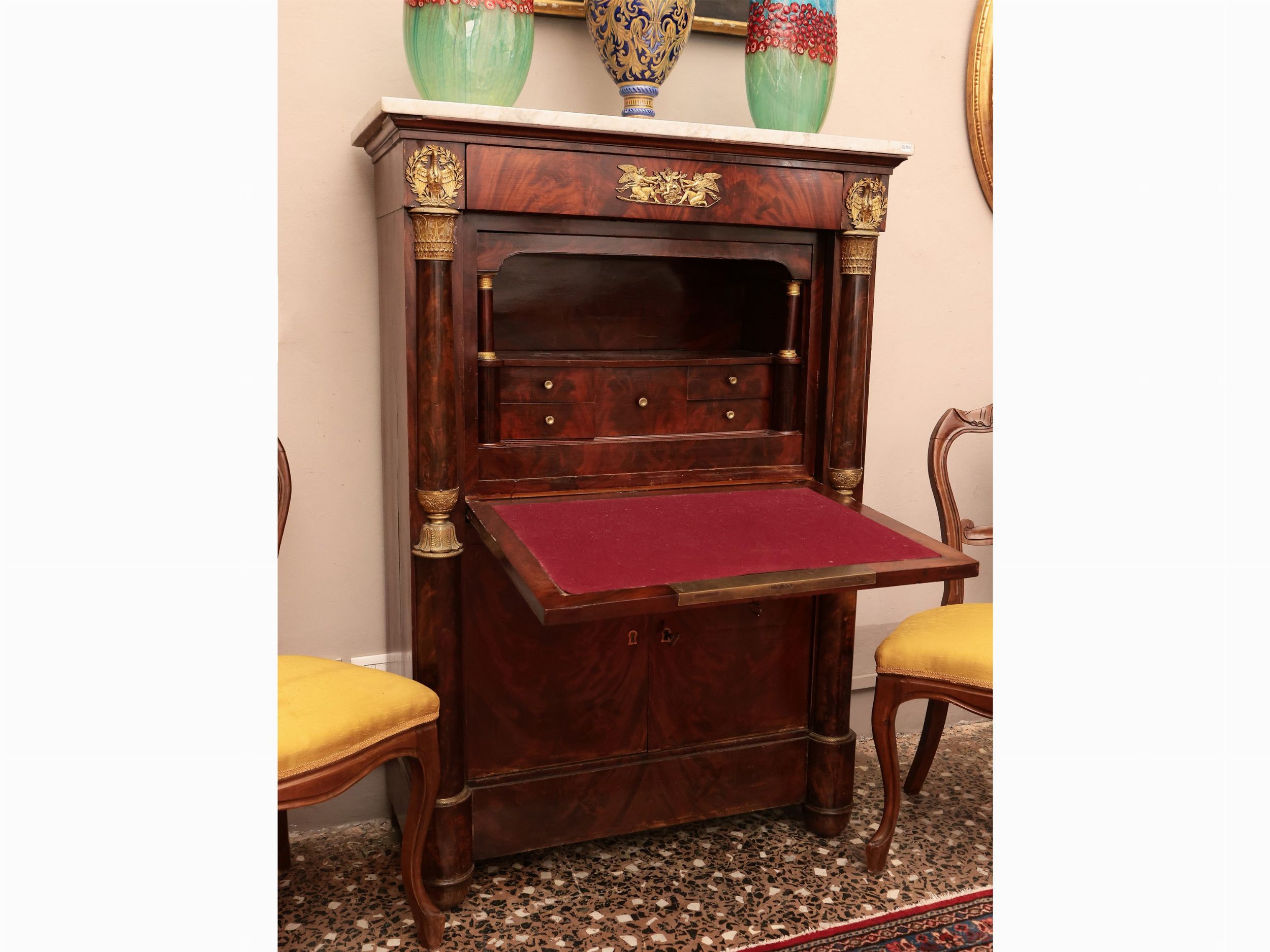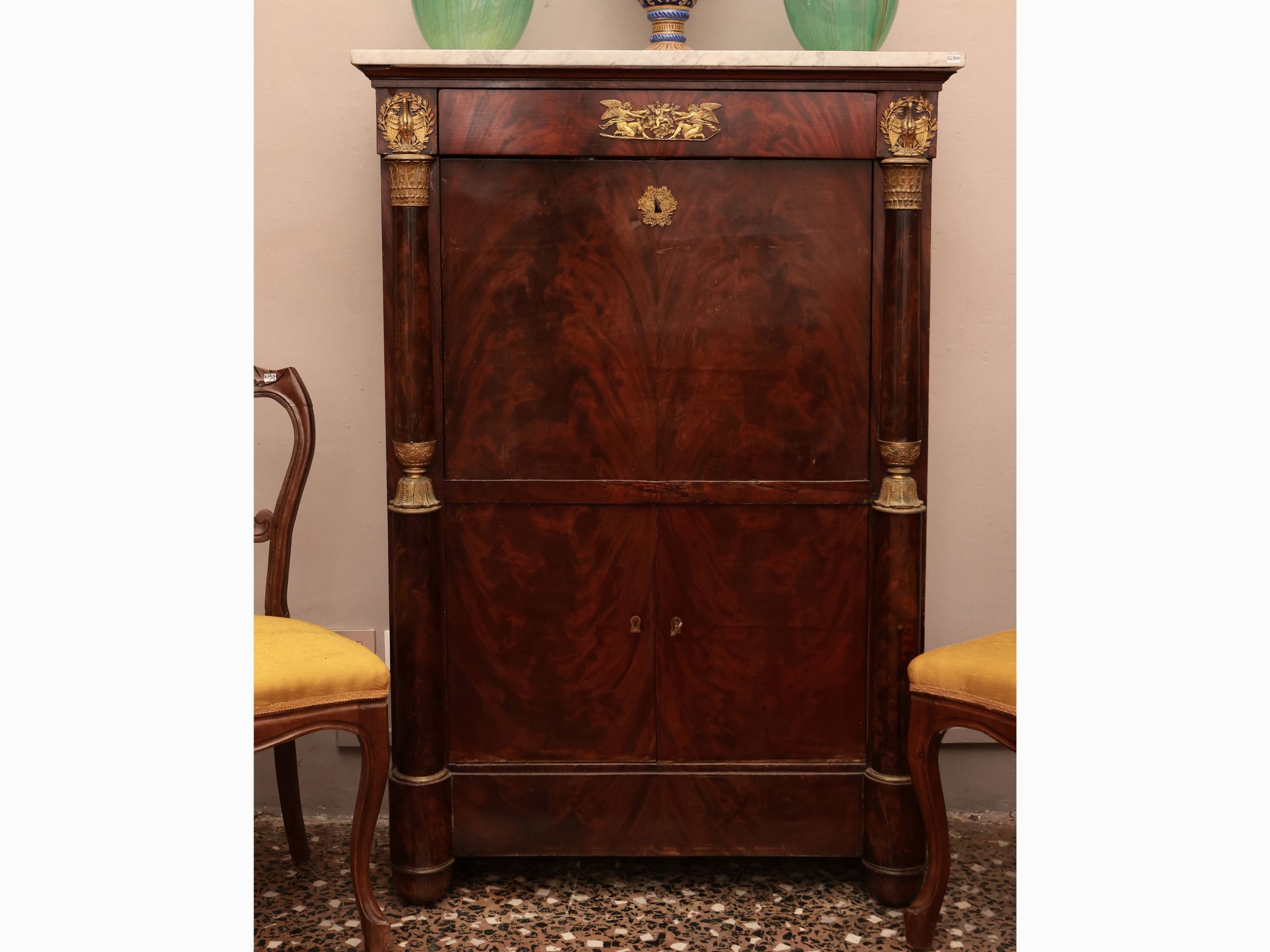 h cm 144x101x42 inizio del XIX secolo piano in marmo bianco, sportello a calatoio a celare scarabattolo in parte rivestito in panno rosso e con cassettini e vano a giorno tra lesene a colonna con finali in bronzo dorato modellati come aquile, due sportelli sottostanti sul fronte dritto, alcuni difetti