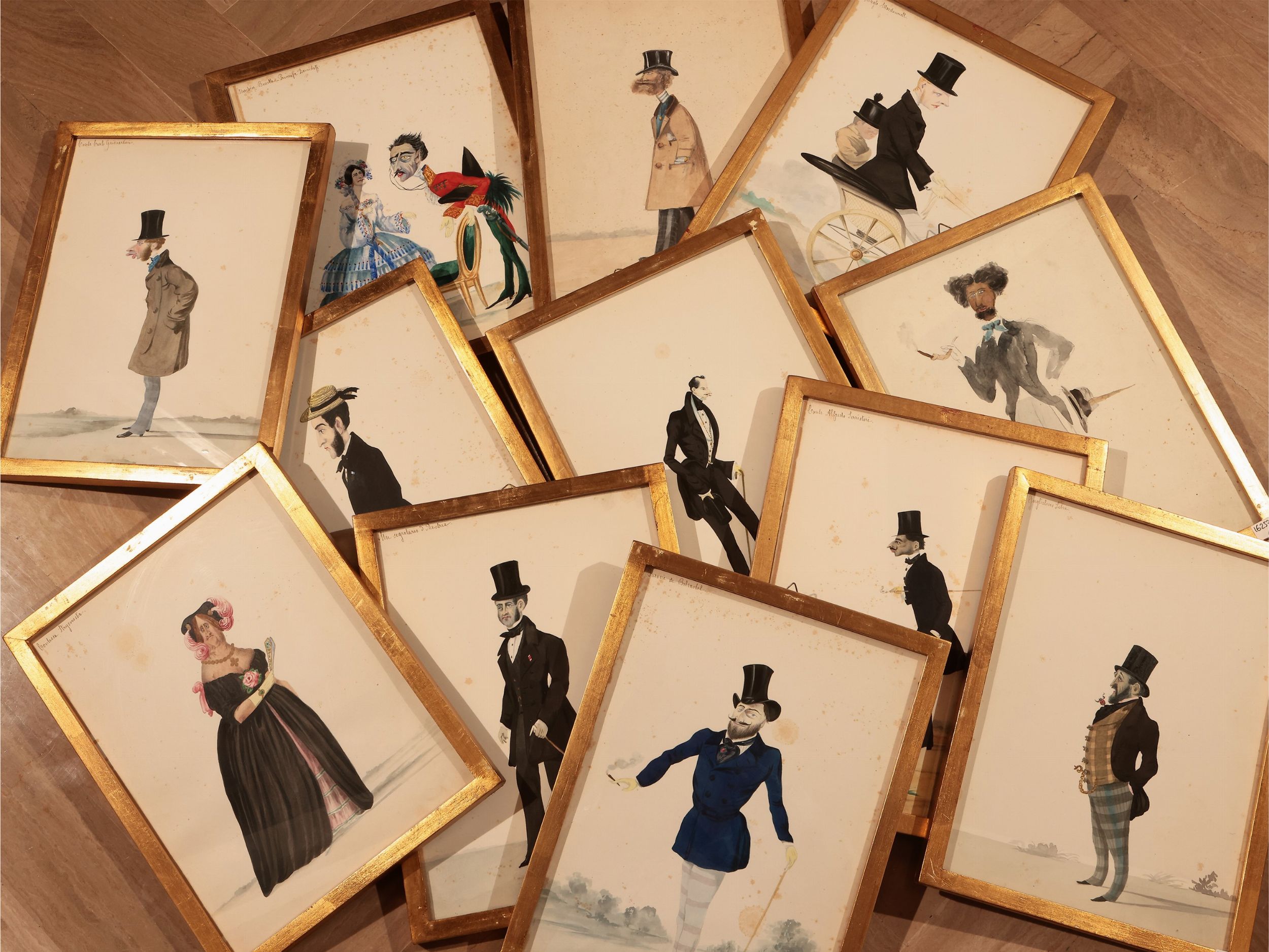 tra cui si riconoscono il principe Demidoff, il conte Alfredo Serristori, il conte Carlo Guicciardini, acquarello su carta, alcuni recano indicazione del personaggio ritratto