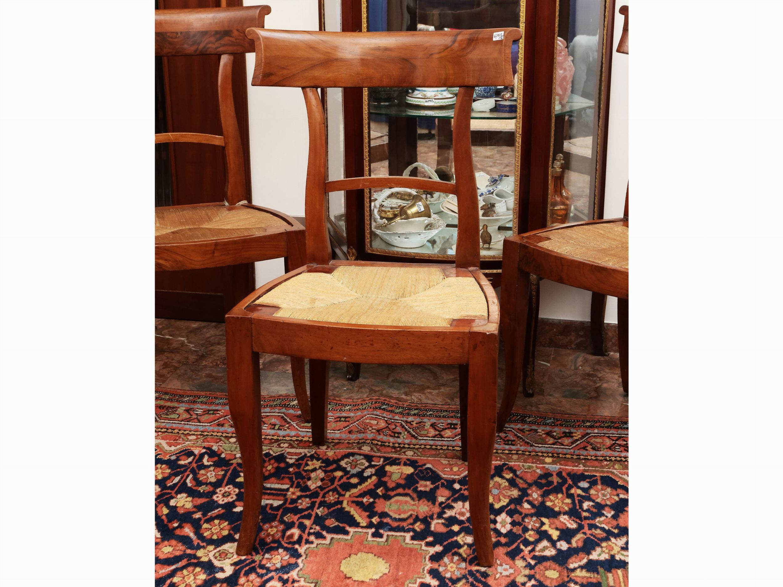 prima metà del XIX secolo Schienale con cartella avvolgente, seduta impagliata, gambe anteriori leggermente mosse, le posteriori a sciabola
