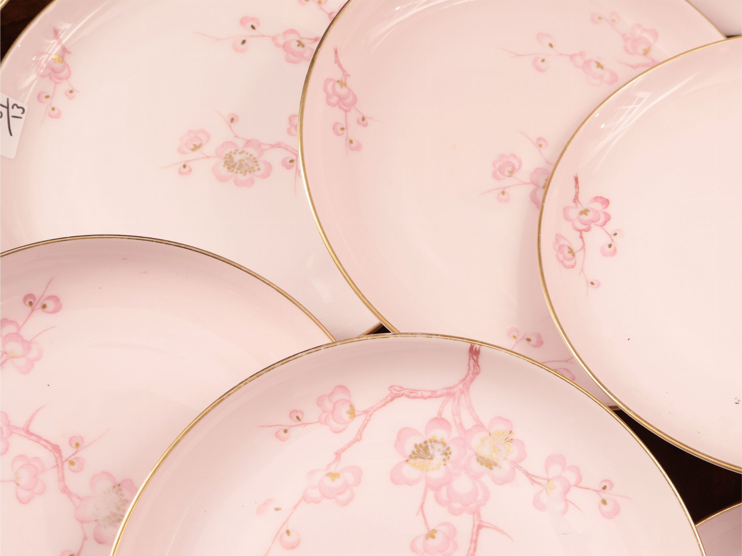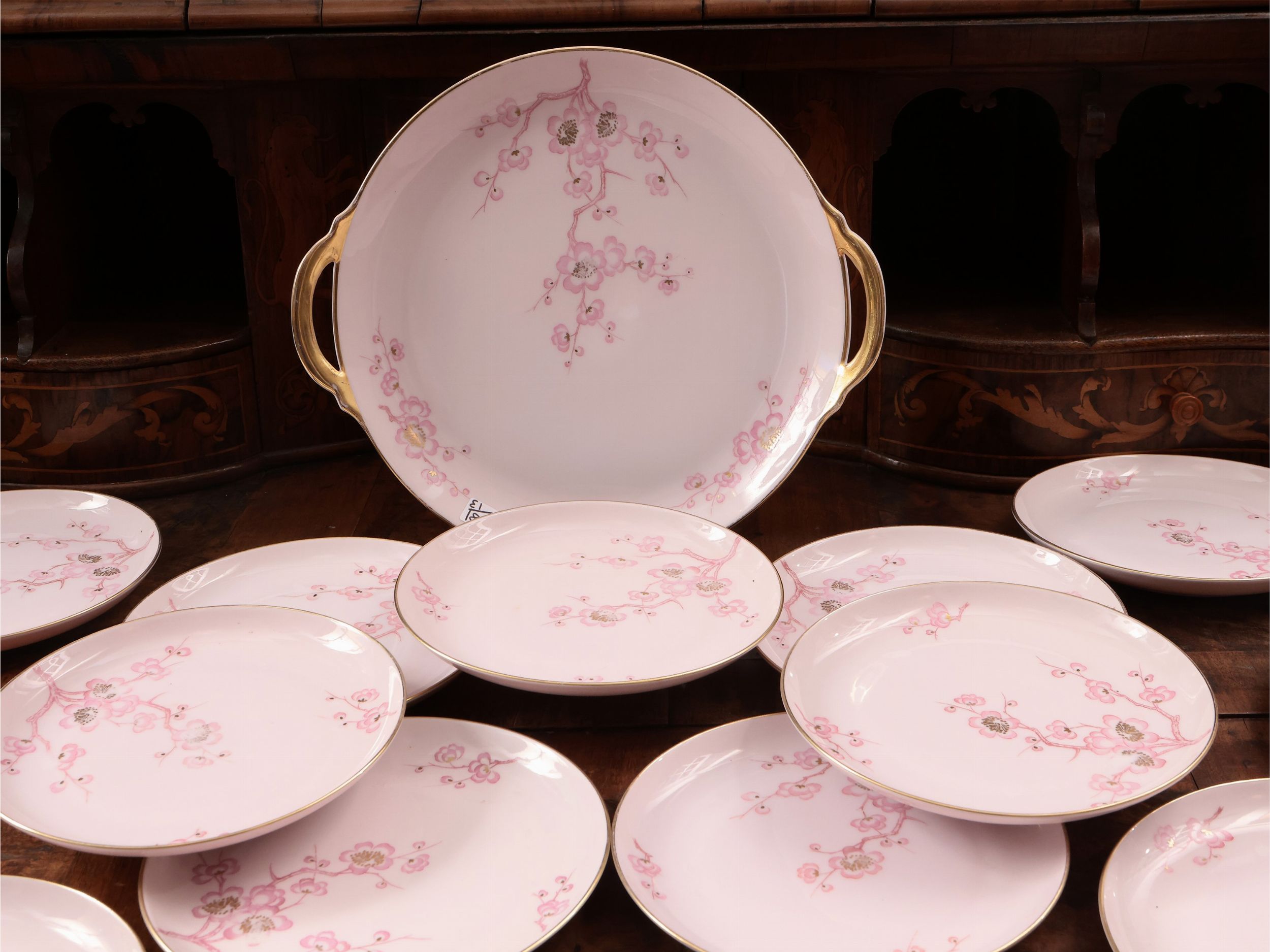 Anni Trenta dipinto con fiori di pesco e lumeggiature dorate, composto da serie di dodici piattini e da vassoio con manici a servire, lievi difetti alla doratura