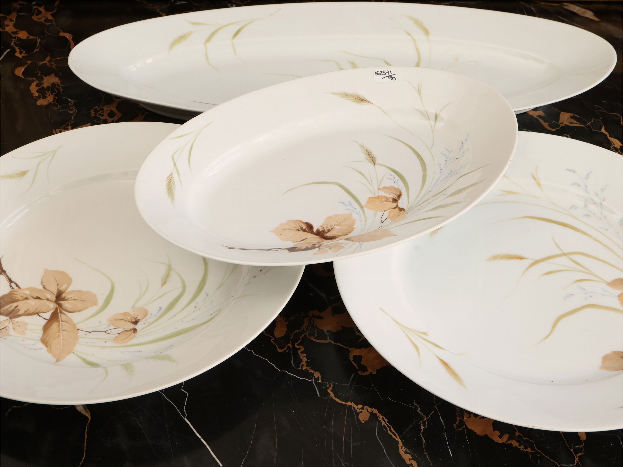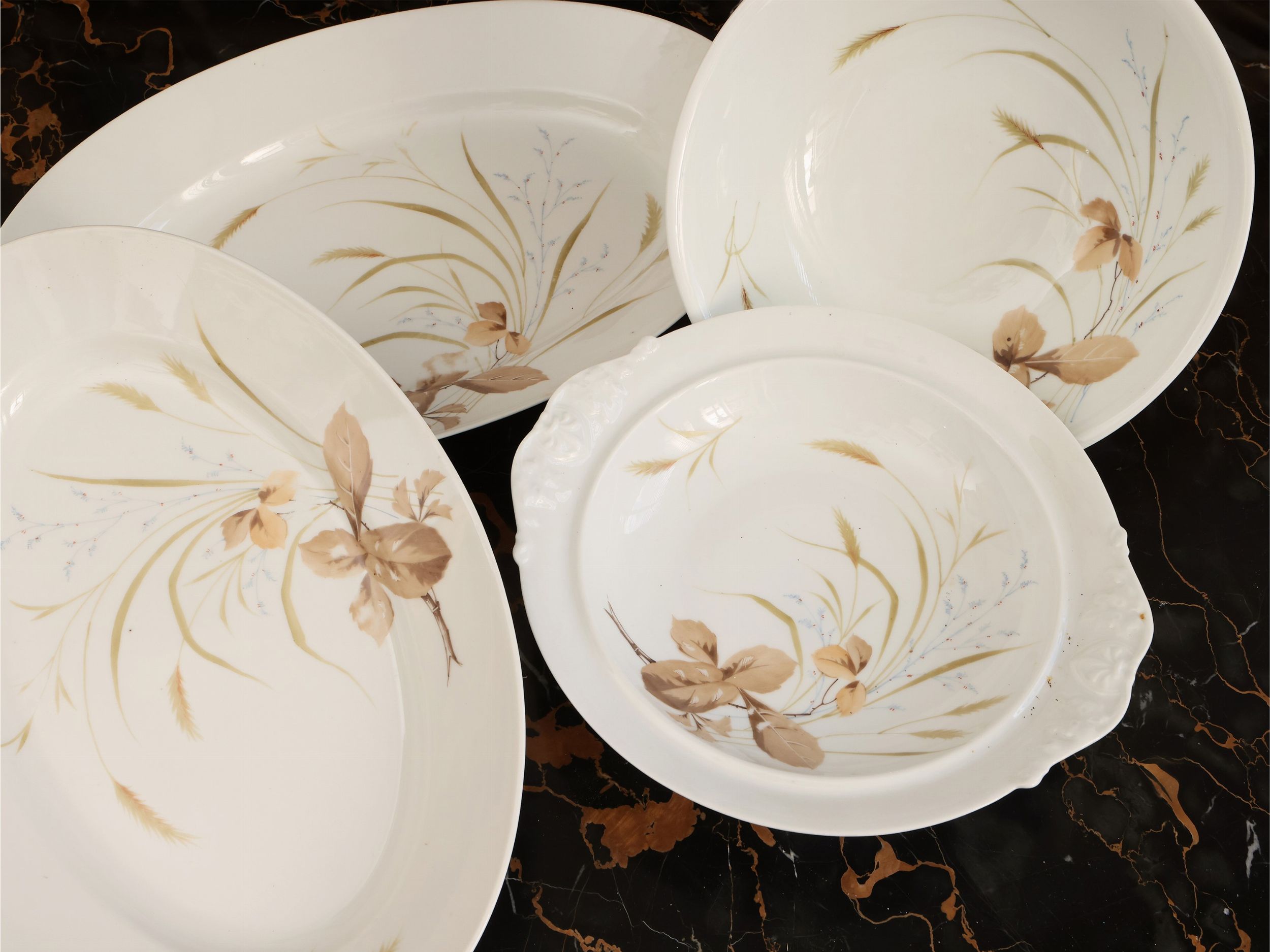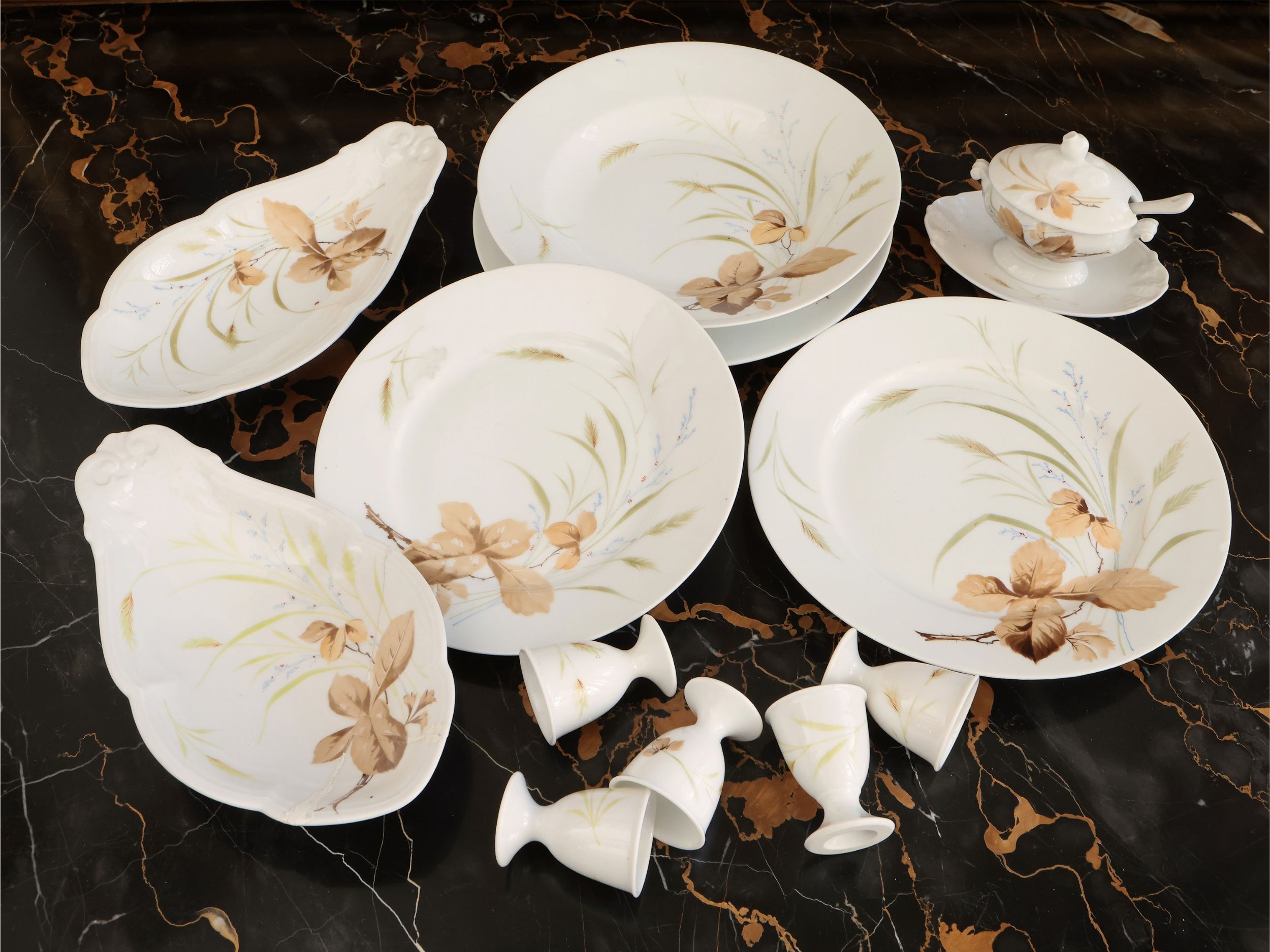 fine del XIX/inizio del XX secolo dipinto con tralci in toni autunnali, composto da 40 piatti piani, 18 piatti fondi, 11 piattini da antipasto, insalatiera, due legumiere di cui una con coperchio, due vassoi rotondi e tre ovali a scalare, pesciera, due alzatine, fruttiera centrotavola con bordo traforato, salsiera con cucchiaio, due raviere, zuccheriera con cucchiaino e cinque portauovo, alcuni difetti