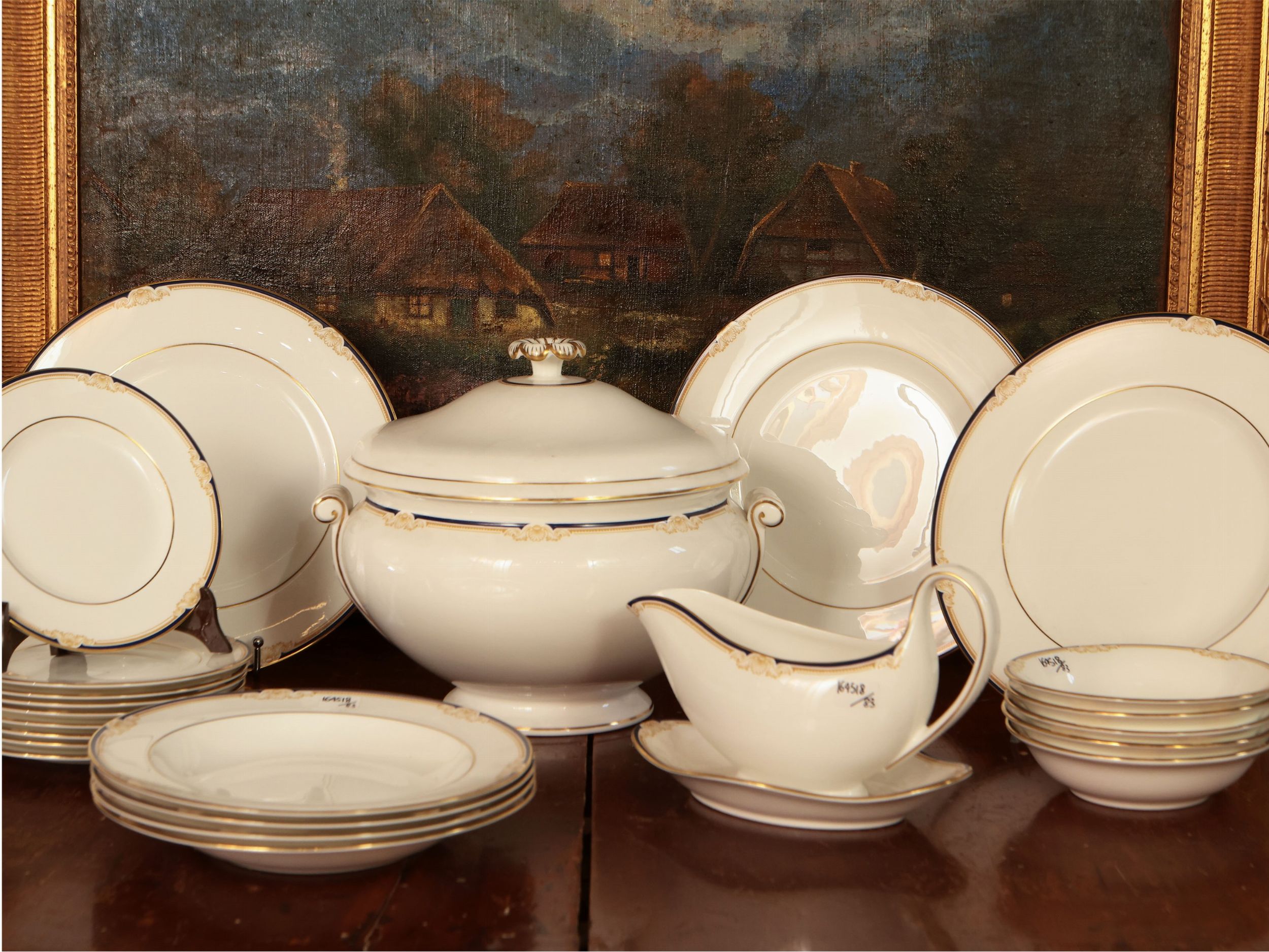 Inghilterra, XX secolo bordo decorato con tralcio floreale lumeggiato oro e profilato blu cobalto, completo per dodici persone, composto da teiera o caffettiera, lattiera, zuccheriera e serie di 12 tazze da tè o caffè americano corredate da piattino, completo per dodici persone, composto da 24 piatti piani, 12 piatti fondi, 12 piattini da antipasto, 12 piattini da pane, 12 coppette da macedonia, una zuppiera, 2 insalatiere, 3 vassoi ovali a scalare e 2 rotondi, 2 raviere ed una salsiera