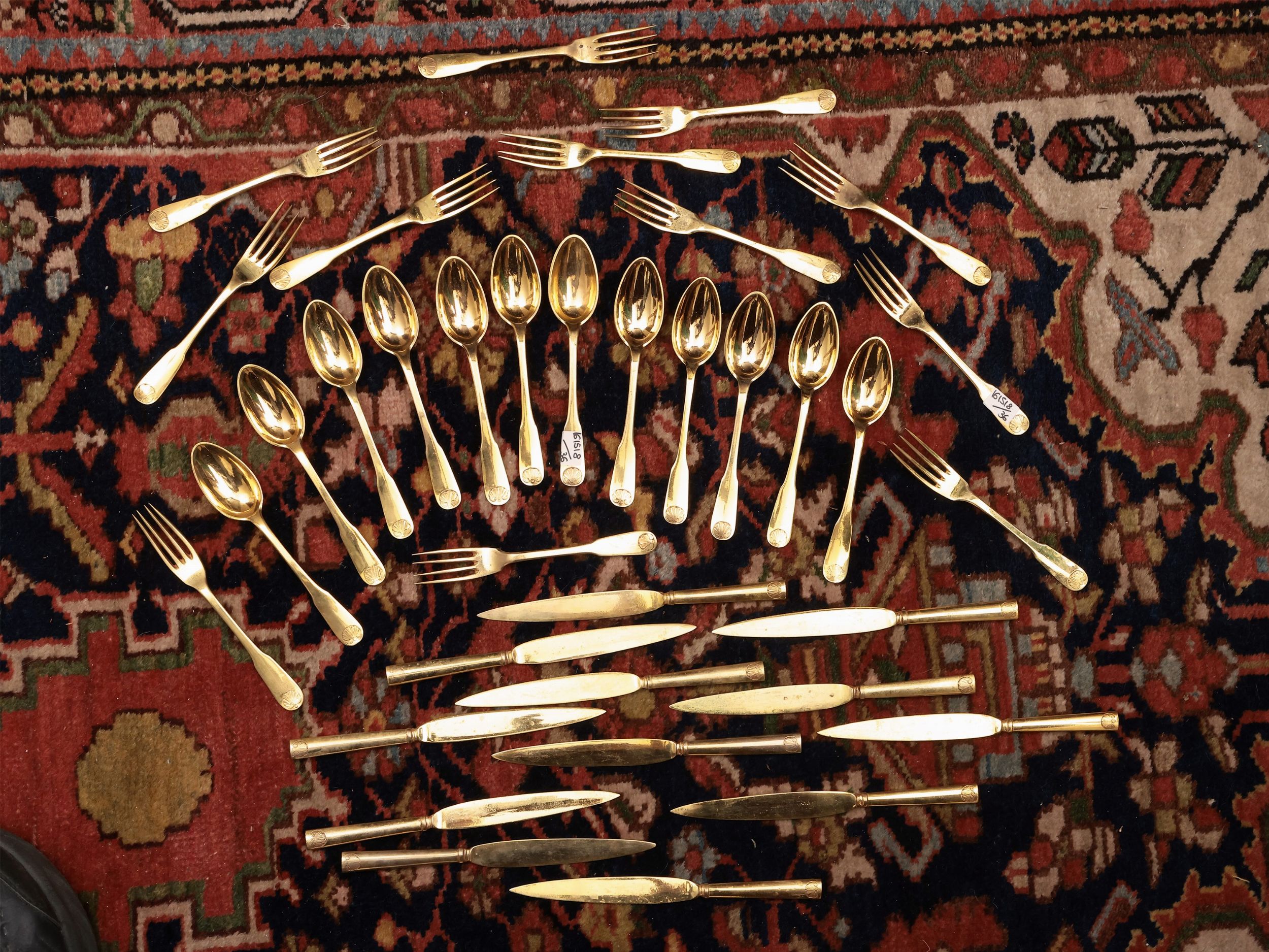 prima metà del XX secolo manici cesellati con motivo di conchiglia, completo per dodici persone, composto da 12 forchettine e coltellini da frutta con 12 cucchiai da dolce (36)