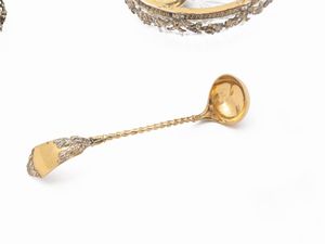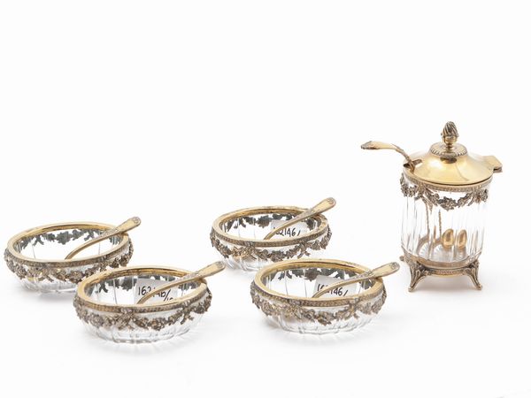 Germania, inizio del XX secolo composto da mostardiera e serie di quattro saliere, corredate da cinque cucchiaini vermeil