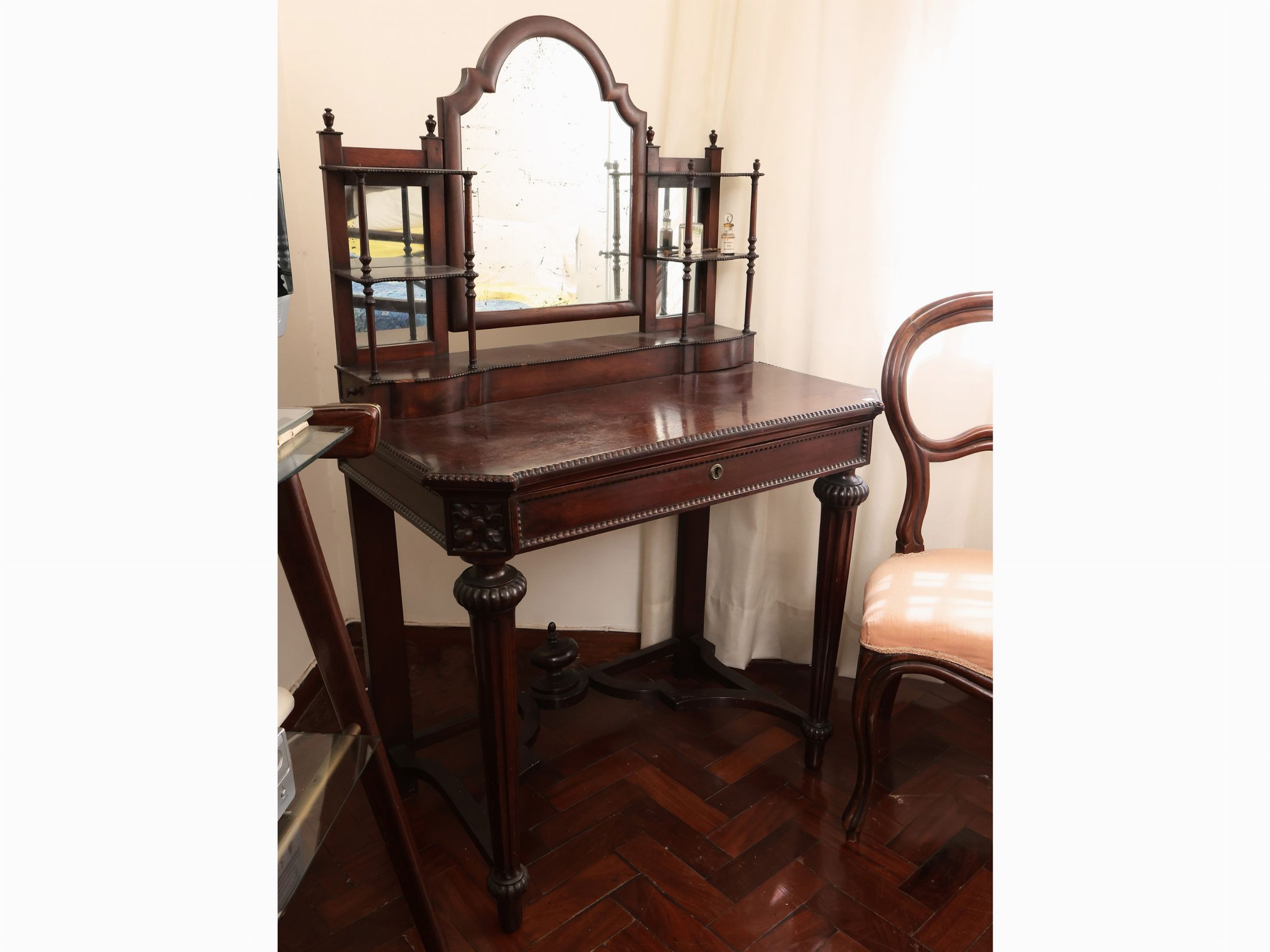 seconda metà del XIX secolo alzata con specchiera a psiche tra vani a giorno, piano con angoli scantonati intagliato con perlinatura, un cassetto nella fascia, gambe a faretra scanalata riunite da traverse sagomate