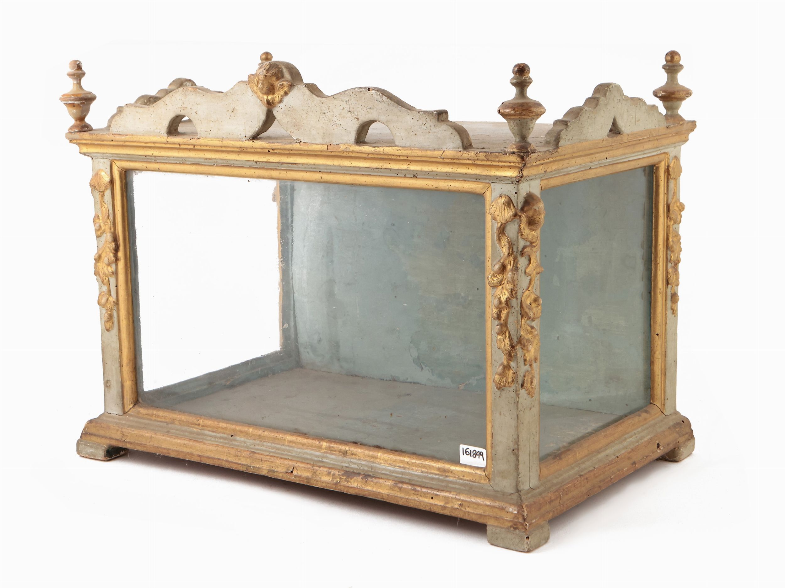 h cm 33x43x27 fine del XVIII secolo cimasa sagomata e centrata da cherubino, intagliata con tralci vegetali ricadenti ai lati con angoli sormontati da pinnacoli, vetri coevi (uno con rottura), lievi difetti