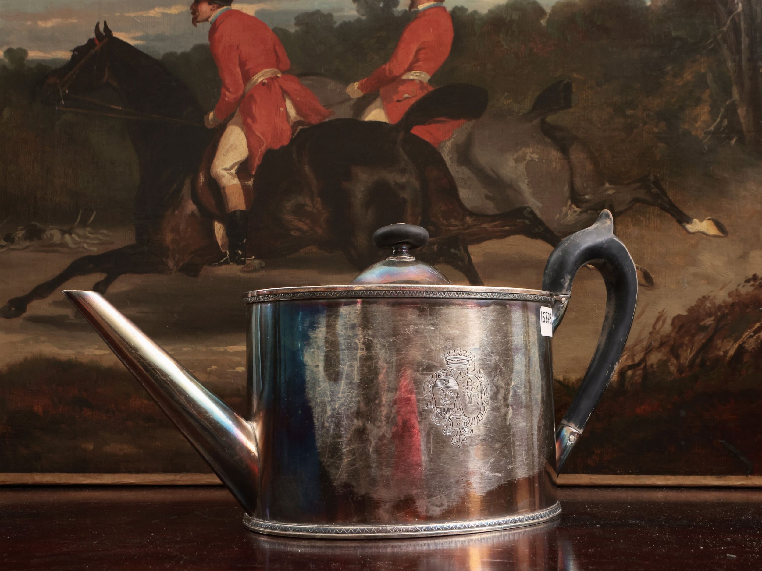 Parigi, 1795-1802 corpo cilindrico a sezione ovale, cesellato con stemma gentilizio, lungo beccuccio, manico e presa in legno ebanizzato