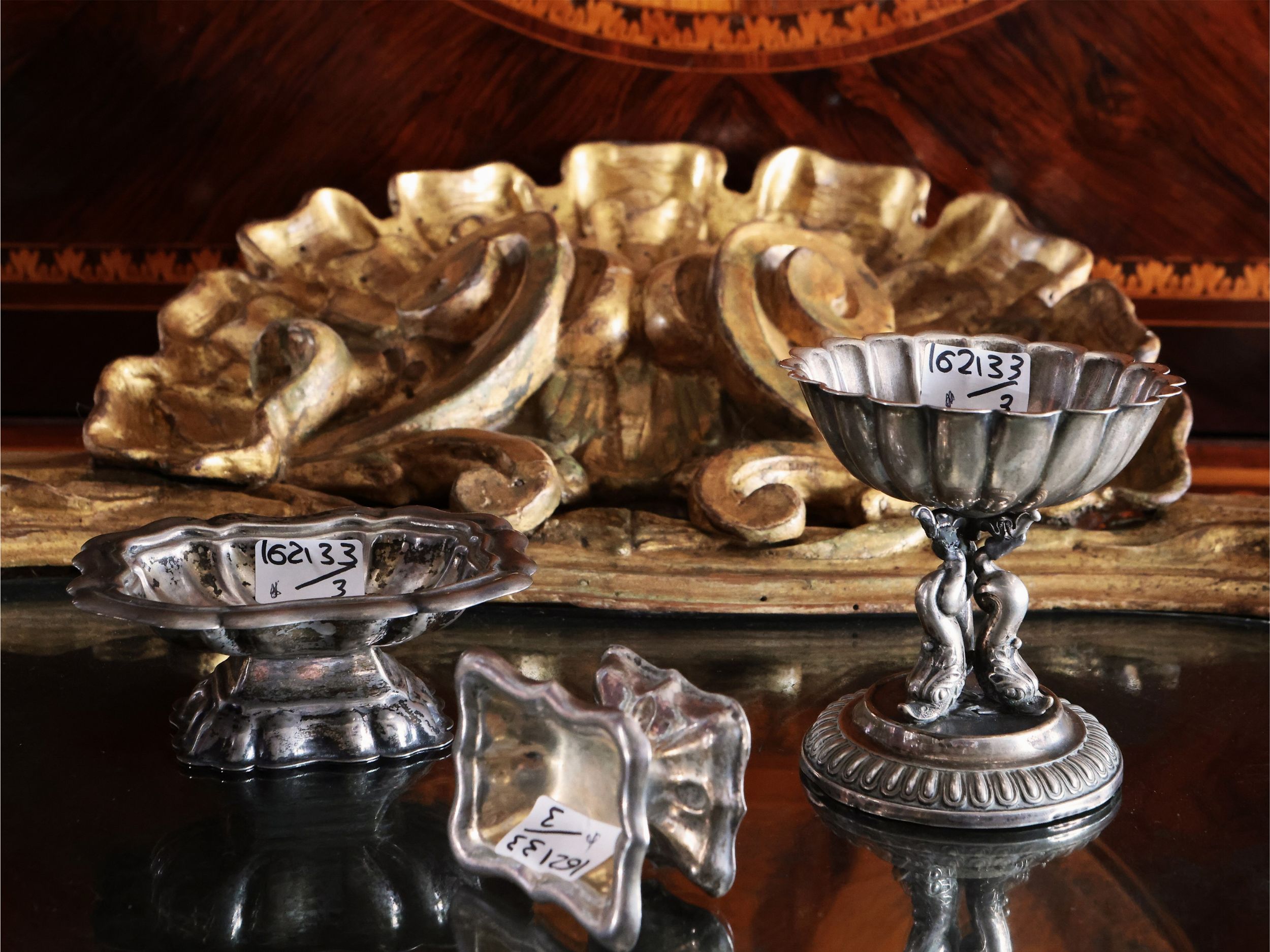 XIX/XX secolo una coppia a foggia di piccole alzate ed una a tripode, sorretta da delfini barocchi con base appesantita