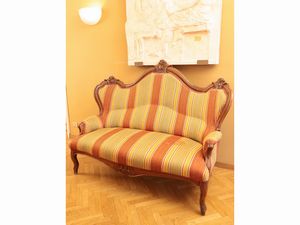 h cm 107x70x60 metà del XIX secolo schienale sagomato intagliato con cartiglio, rivestite in filaticcio rigato, [..]