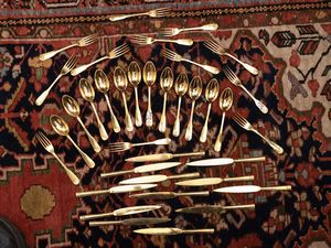 gr 220, h cm 4 XVIII/XIX secolo interno vermeil, abbinate a due cucchiaini cesellati con stemma gentilizio
