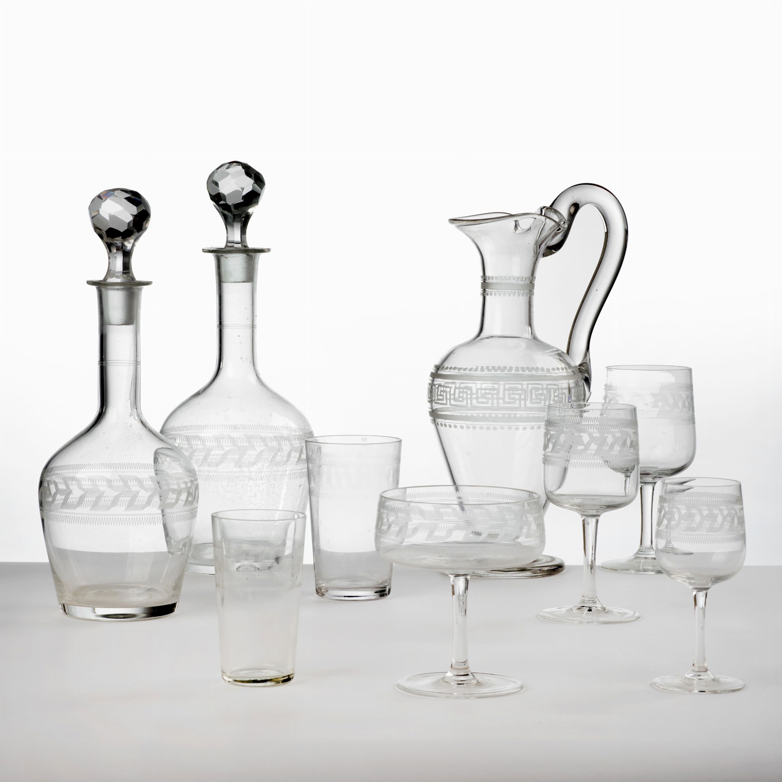 Composto da 50 pezzi di cui: 8 coppe (cm 11,5 h), 12 bicchieri (cm 11,5 h), 9 bicchieri (cm 15,8 h), 3 bicchieri (cm 14,5 h), 5 bicchieri (cm 12 h), 8 bicchierini da dessert (cm 10,2 h), 2 caraffe (cm 29,8 h), 3 bottiglie da vino (due di cm 31,5 h e una di cm 28,5 h). Servizio incompleto, un bicchiere e un bicchierino da dessert con una lieve sbeccatura, alcuni bicchieri molati.