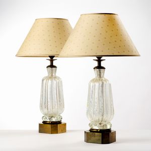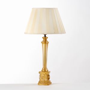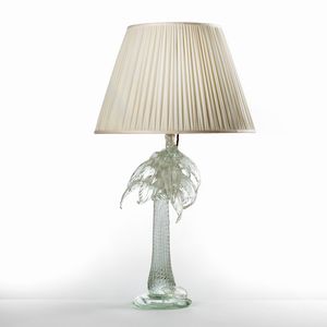 Vetro trasparente con applicazioni a foglie d'oro, cm 34x15 (vetro), cm 70,5x45 (con base e paralume), ognuna [..]