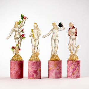 Sculture in vetro, cm 24,5 h ca. ognuna Le statuette ornavano una fontana da interni. Alcune rotture, sbeccature [..]