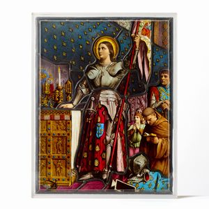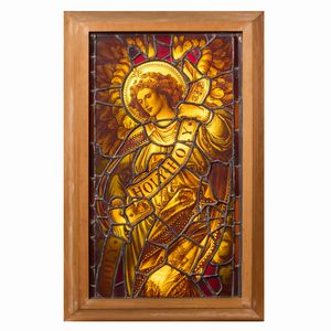 Vetro istoriato legato a piombo, cm 84,5x49, cm 102x64,5 (con cornice). Manifattura di ambito preraffaellita, [..]