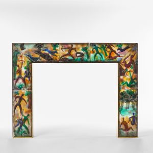 Pasta di vetro trattata con acido policromo ad applicazioni, telaio in ferro, cm 83x110 (assieme) 1940 ca. Caminetto [..]