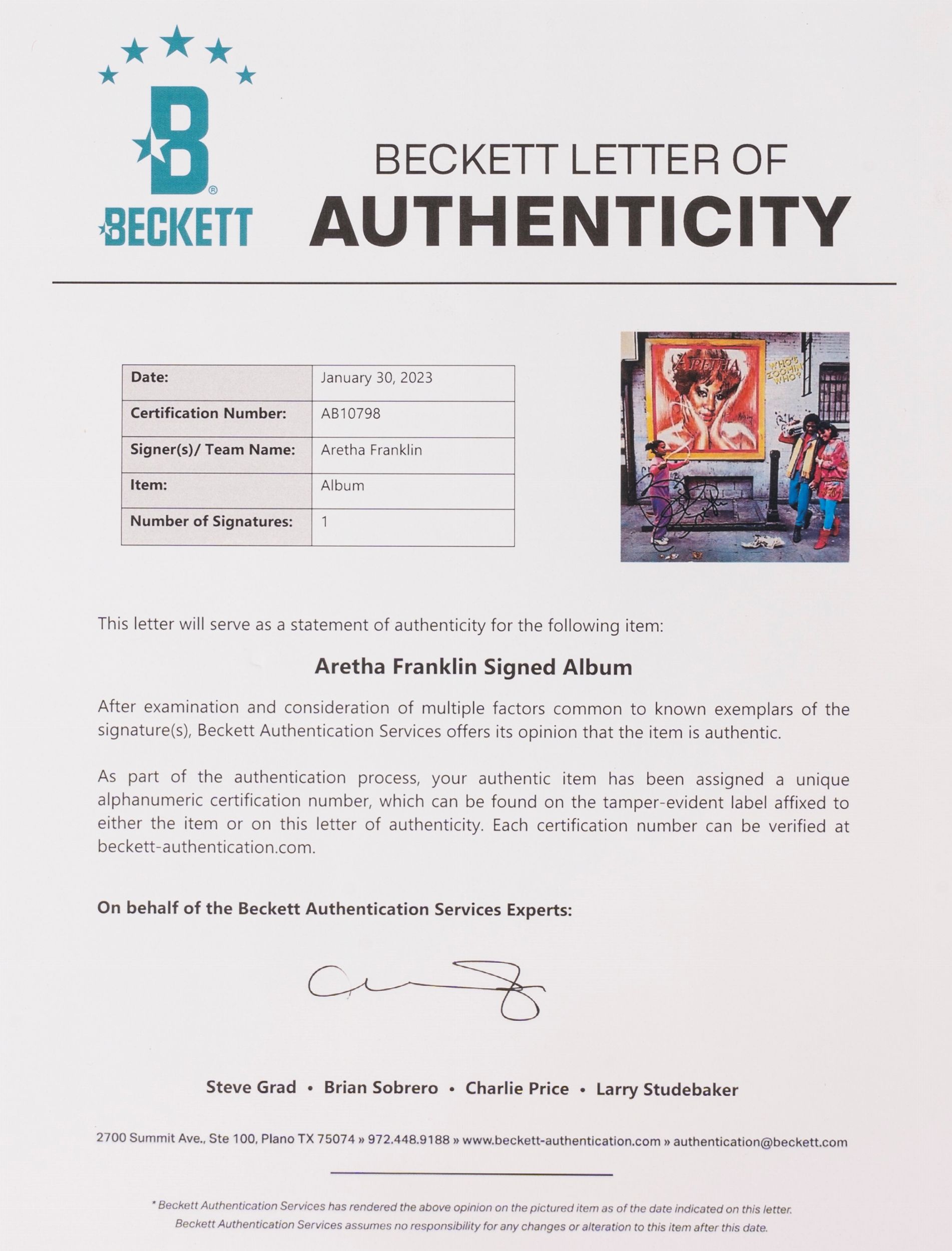 Who's Zoomin' Who?, storico LP autografatao dalla regina della musica Soul, Aretha Franklin: con certificazione Beckett. Segni di usura lungo i bordi. Aretha Franklin ่ una delle voci pi๙ iconiche e influenti della musica soul e R&B, con una carriera straordinaria che ha attraversato cinque decenni. Una delle sue canzoni pi๙ memorabili e popolari degli anni '80 ่ sicuramente 'Who's Zoomin' Who?', un brano che ha segnato il ritorno di Franklin al successo mainstream e ha catturato l'energia e lo spirito dell'epoca. Lanciata nel 1985, 'Who's Zoomin' Who?' ่ diventata una hit internazionale e ha rappresentato un ritorno al successo per Aretha Franklin dopo un periodo di relativa calma nella sua carriera. La canzone mescola elementi di soul, funk e pop, creando un sound irresistibile e contagioso che ha conquistato il pubblico di tutto il mondo. La canzone ha raggiunto le vette delle classifiche in diversi paesi e ha consolidato la posizione di Aretha Franklin come una delle artiste pi๙ versatili e amate della sua generazione. Il videoclip della canzone, che mostra Aretha in diverse location di New York City, ha contribuito a rendere la canzone ancora pi๙ popolare e ha catturato l'essenza dell'epoca degli anni '80. 'Who's Zoomin' Who?' affronta temi universali come l'amore, il desiderio e l'ambiguitเ delle relazioni. La canzone esplora la dinamica complessa tra due persone che si attraggono ma sono incerte sui loro sentimenti reciproci. Aretha Franklin ha avuto un impatto profondo sulla musica e sulla cultura popolare, influenzando generazioni di artisti con la sua voce potente e la sua interpretazione emotiva. 'Who's Zoomin' Who?' ่ solo uno dei tanti successi nella lunga e illustre carriera di Aretha, ma rappresenta perfettamente la sua capacitเ di reinventarsi e di rimanere rilevante in un'industria musicale in continua evoluzione.