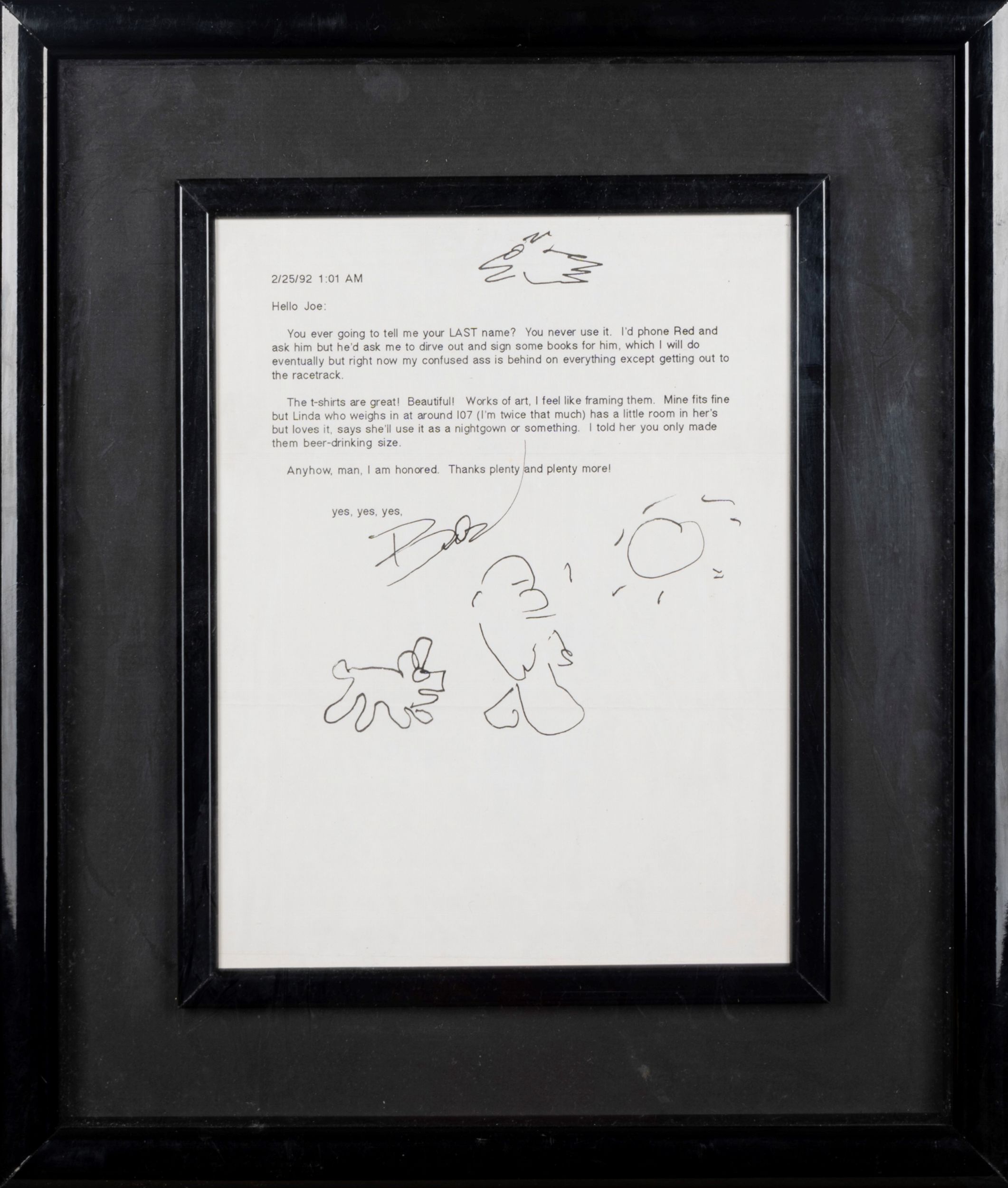 Lettera con firma e disegni originali di Charles Bukowski. Oltre alla lettera è compresa anche la busta con la quale la lettera è stata inviata, scritta a mano da Bukowski. Incorniciata in modo professionale. La lettera fu inviata come ringraziamento al responsabile dello shop della Queen's University di Belfast, in Irlanda. Bukowski infatti aveva concesso l’autorizzazione all’università di realizzare alcune magliette con il suo volto e con alcune sue frasi celebri da poter vendere nello shop dell’università. Una volta realizzate il responsabile dello shop gli aveva spedito alcune magliette in regalo. Questa è la risposta di Bukowski come ringraziamento delle magliette ricevute. Charles Bukowski è stato uno scrittore e poeta americano conosciuto per il suo stile franco e senza compromessi. Nato nel 1920 a Andernach, in Germania, Bukowski è cresciuto a Los Angeles e ha trascorso gran parte della sua vita nella città. Le sue opere affrontano spesso temi come la vita nella classe lavoratrice, l'alcolismo, il sesso e la solitudine urbana. Tra i suoi romanzi più famosi ci sono 'Post Office', 'Factotum' e 'Ham on Rye', che riflettono la sua esperienza di vita e le sue osservazioni sulla società. Bukowski è anche noto per la sua poesia, caratterizzata da uno stile diretto e crudo che esplora le esperienze umane più oscure e autentiche. La sua scrittura è stata spesso criticata per essere controversa e cruda, ma ha guadagnato anche una vasta base di fan e ha influenzato molti scrittori successivi. Bukowski è considerato una figura importante nella letteratura contemporanea e il suo impatto culturale continua a essere rilevante anche dopo la sua morte nel 1994.