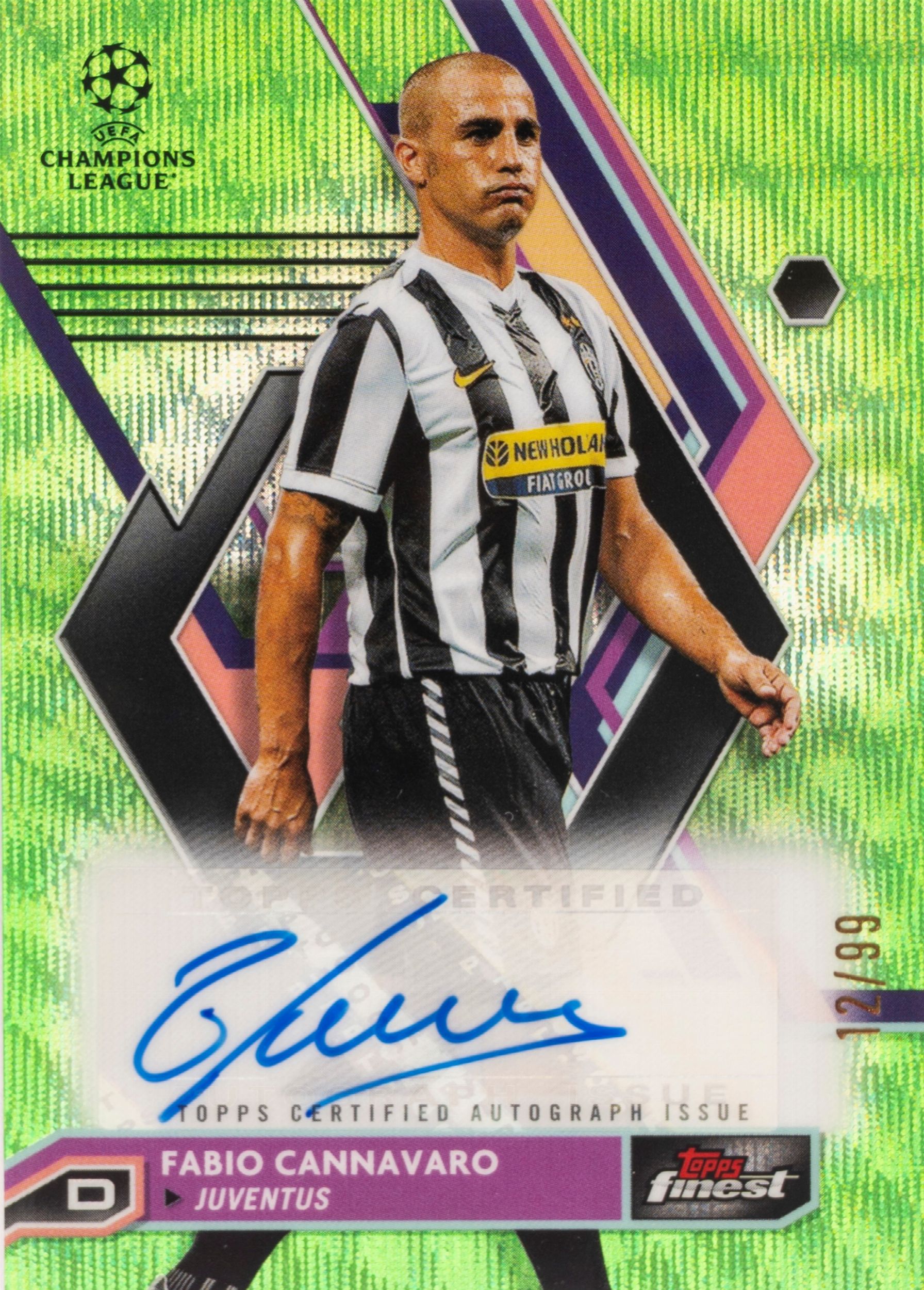 Card autografata di Fabio Cannavaro con la maglia della Juventus, pubblicata dalla Topps nel 2022/23 per la serie Finest UCL. Fabio Cannavaro è un ex calciatore italiano e attuale allenatore, considerato uno dei migliori difensori della sua generazione. Ha giocato per club come il Napoli, il Parma, l'Inter di Milano, il Real Madrid e il Juventus. Cannavaro è noto per la sua forza fisica, il suo senso della posizione e la sua abilità nel contrastare gli attacchi avversari. Ha vinto numerosi titoli nazionali e internazionali, tra cui la Serie A italiana, la Coppa Italia, la UEFA Champions League e la Coppa del Mondo FIFA. Nel 2006, è stato capitano della nazionale italiana che ha vinto la Coppa del Mondo FIFA, guadagnandosi anche il premio Pallone d'Oro come miglior giocatore del mondo. Dopo il ritiro, ha intrapreso la carriera di allenatore, guidando varie squadre in Italia e in Cina.