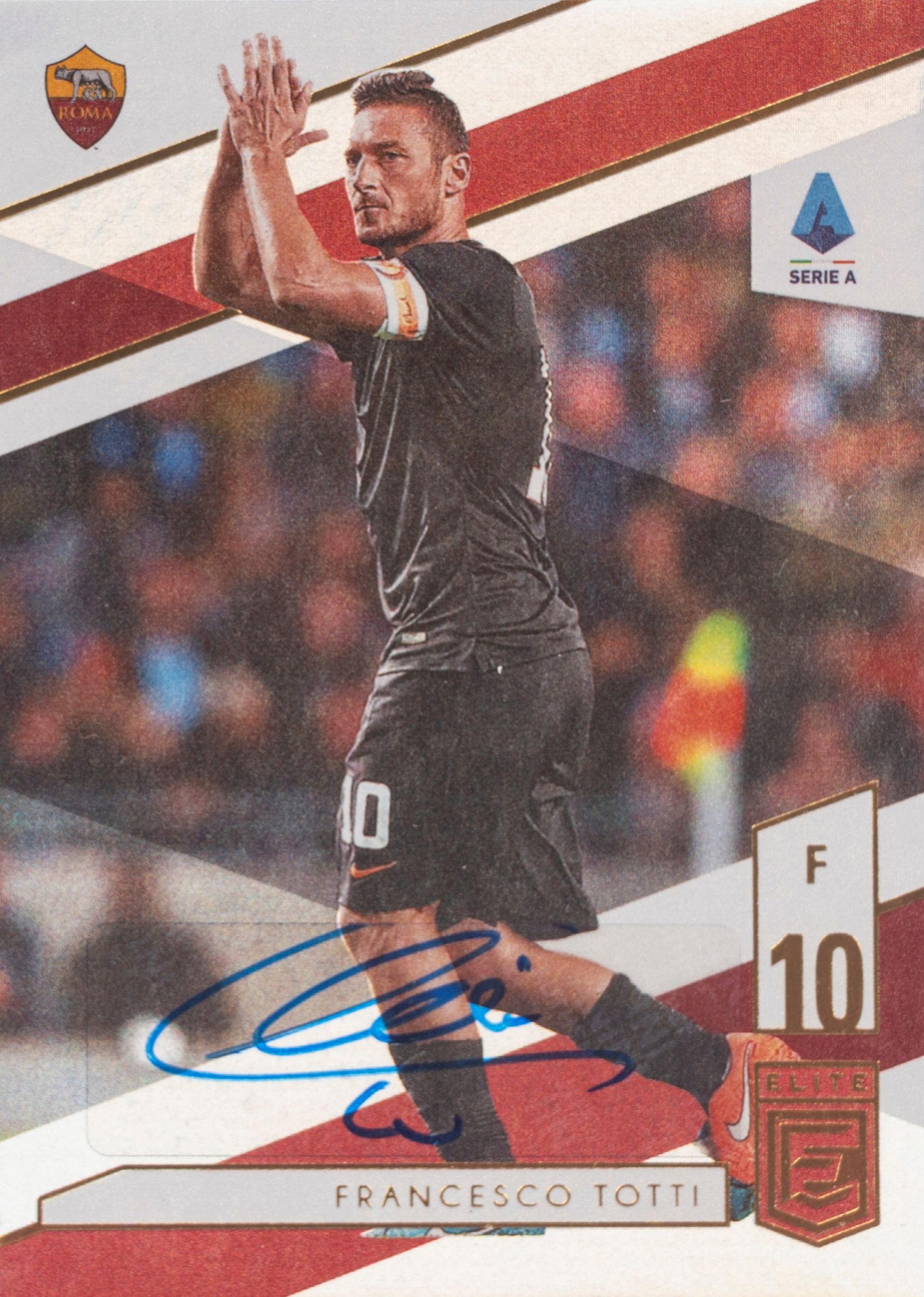 Card autografata di Francesco Totti con la maglia della Roma, pubblicata dalla Panini nel 2019 per la serie Chronicles Elite. Francesco Totti è un ex calciatore italiano, noto per la sua lunga e illustre carriera con la Roma, squadra per cui ha giocato per tutta la sua vita professionale. Totti è considerato uno dei migliori giocatori della storia della Roma e del calcio italiano. Era noto per la sua abilità tecnica, la sua visione di gioco e la sua capacità di segnare gol decisivi. Ha vinto numerosi titoli nazionali e ha rappresentato la Nazionale italiana in molte competizioni internazionali, vincendo la Coppa del Mondo FIFA nel 2006. Dopo il ritiro, Totti ha continuato a essere coinvolto nel calcio, sia come dirigente della Roma che come commentatore sportivo. È una vera leggenda del calcio italiano.