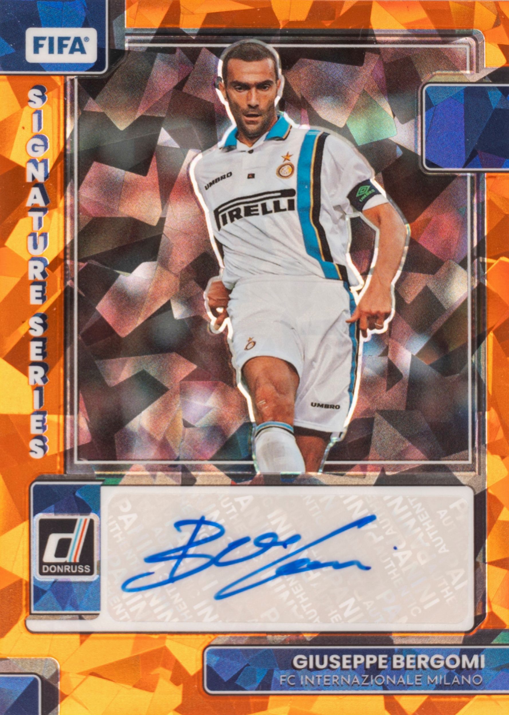 Card autografata di Giuseppe Bergomi con la maglia dell’Inter, pubblicata dalla Panini nel 2022/23 per la serie Donruss Soccer. Giuseppe Bergomi, noto come 'Beppe', è un ex calciatore italiano e uno dei difensori più iconici nella storia del calcio italiano. Ha trascorso tutta la sua carriera professionale con l'Inter di Milano, diventando uno dei giocatori più longevi e fedeli del club. Bergomi è noto per la sua solidità difensiva, il suo senso della posizione e la sua leadership in campo. Ha vinto numerosi trofei con l'Inter, inclusi titoli di Serie A, Coppa Italia e Coppa UEFA. Bergomi ha anche rappresentato la nazionale italiana, vincendo la Coppa del Mondo FIFA nel 1982. Dopo il ritiro, ha intrapreso la carriera di opinionista televisivo e commentatore sportivo.