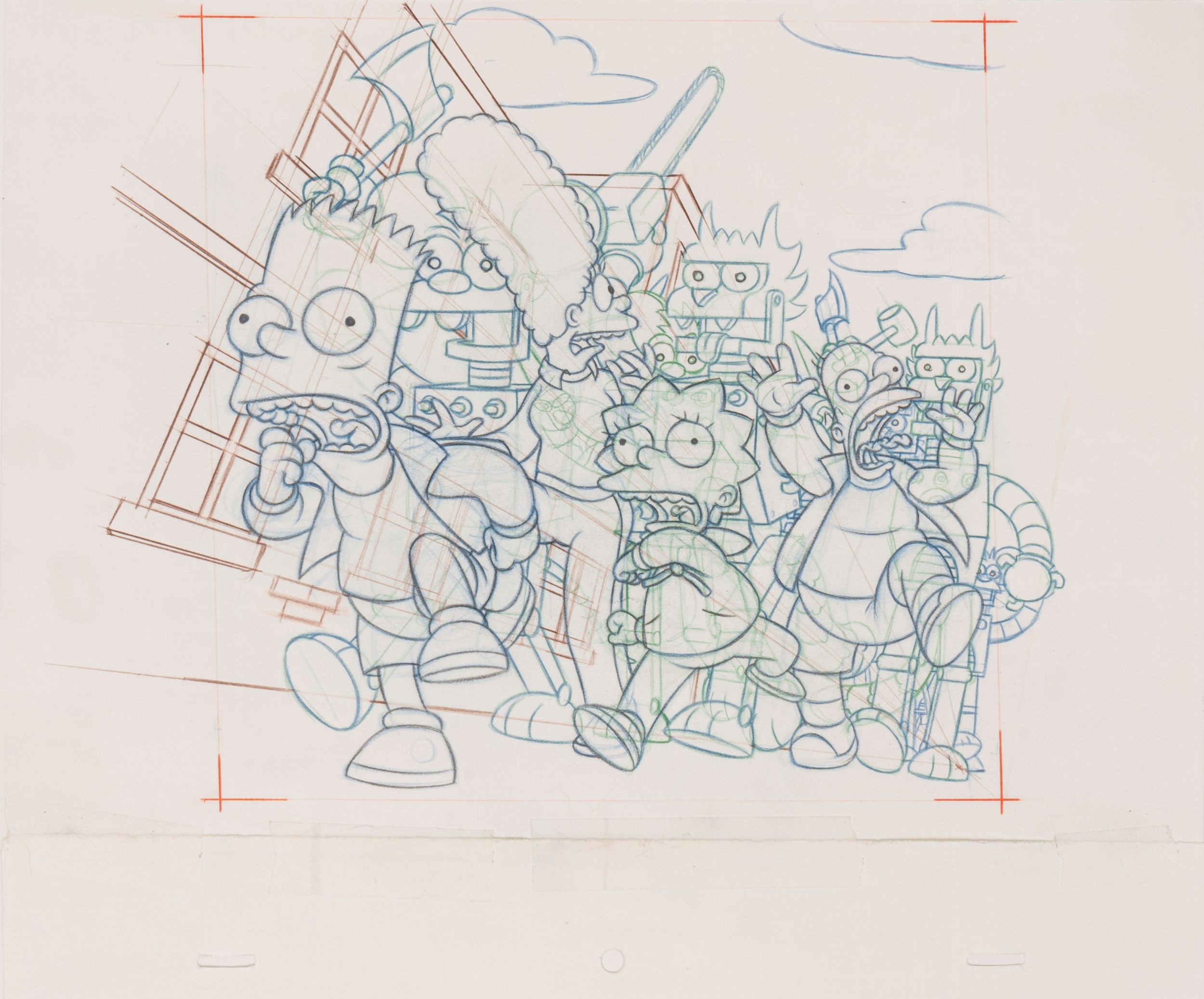 Disegno di produzione originale dei Simpson per l’episodio 4 della sesta stagione intitolato “Itchy & Scratchy Land”, uno dei più belli e famosi dell’intera serie. Trasmesso per la prima volta nel 1994, l'episodio è diventato uno dei più amati e citati dai fan della serie per la sua satira acuta dei parchi divertimento e per le sue numerose gag legate al mondo di 'Itchy & Scratchy', il famoso cartone violento che appare regolarmente all'interno dello show. L'episodio segue la famiglia Simpson mentre si reca a 'Itchy & Scratchy Land', un parco divertimenti dedicato alla violenta coppia di cartoni animati Itchy (il topo) e Scratchy (il gatto). Tuttavia, le cose non vanno come previsto quando un gruppo di robot Itchy & Scratchy inizia a malfunzionare e a mettere in pericolo i visitatori del parco. La famiglia Simpson dovrà quindi cercare di sopravvivere all'assalto dei robot e risolvere la situazione. 'Itchy & Scratchy Land' è una parodia esilarante dei parchi divertimento e delle loro attrazioni. L'episodio prende di mira le lunghe code, i prezzi esorbitanti, le attrazioni pericolose e la commercializzazione eccessiva che spesso caratterizzano questi luoghi. Attraverso le avventure della famiglia Simpson, l'episodio esplora in modo ironico e divertente le gioie e le frustrazioni di una visita a un parco divertimenti. Come sempre, le sequenze di 'Itchy & Scratchy' presentate nell'episodio sono estremamente violente e esagerate, con Itchy che infligge crudeli torture a Scratchy in modi sempre più creativi e macabri. Queste sequenze servono da controparte comica e satirica alla trama principale dell'episodio e sono diventate alcune delle più memorabili e amate dai fan della serie.